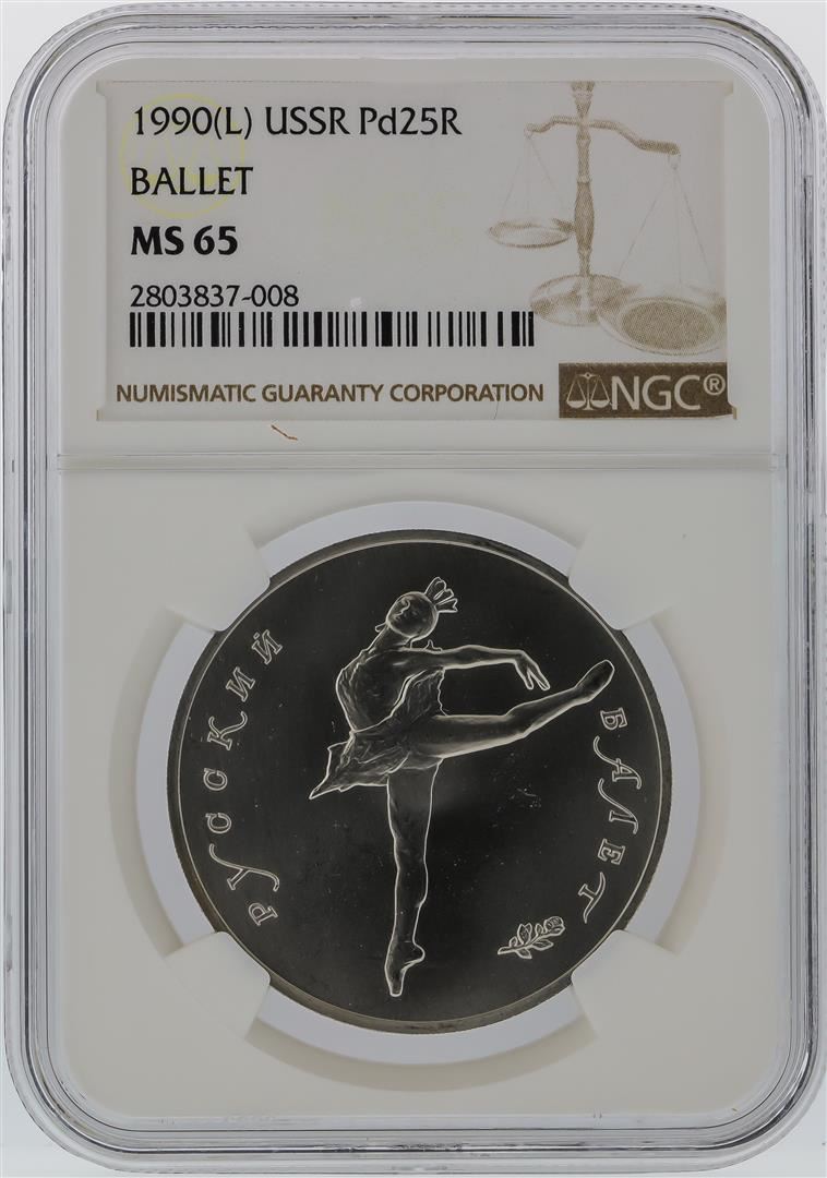 One 1990(L) NGC MS65 USSR Palladium 25 Rubles Ballet Coin. NGC Certified.