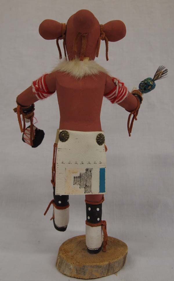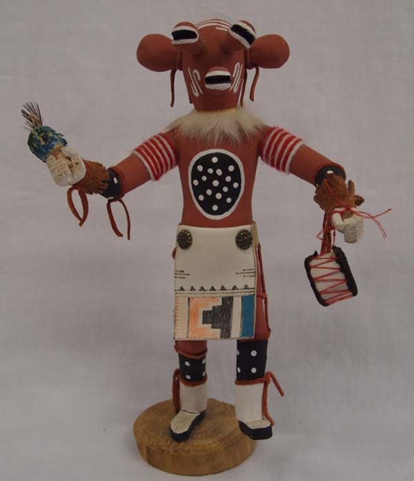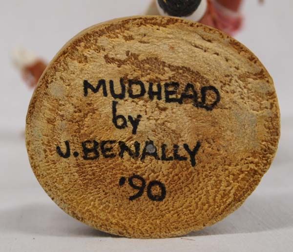 1990 Navajo Mudhead Kachina by James Benally, embellished with rabbit fur, leather, and brass brads, signed on bottom by artist, measures 9.5''H x 6''W