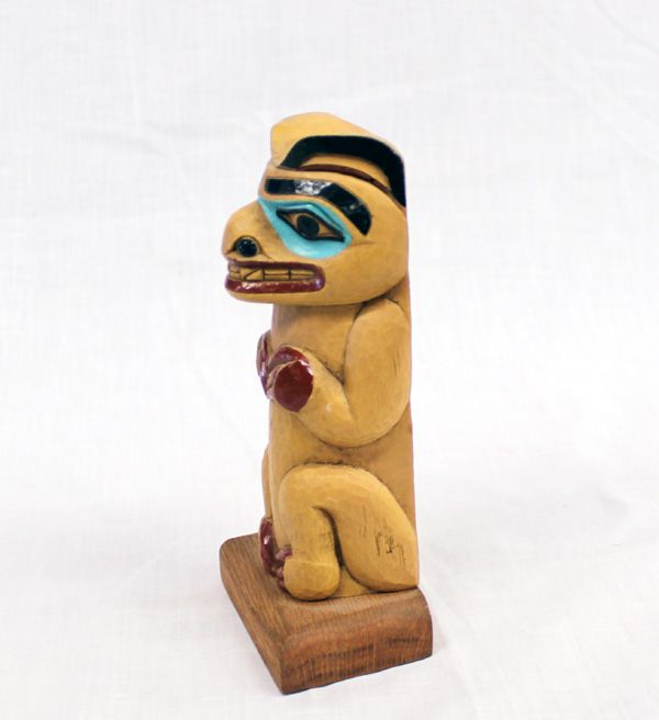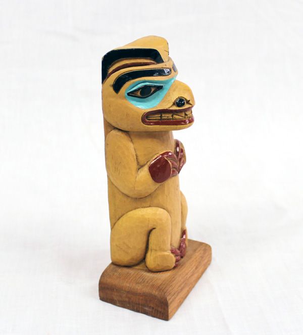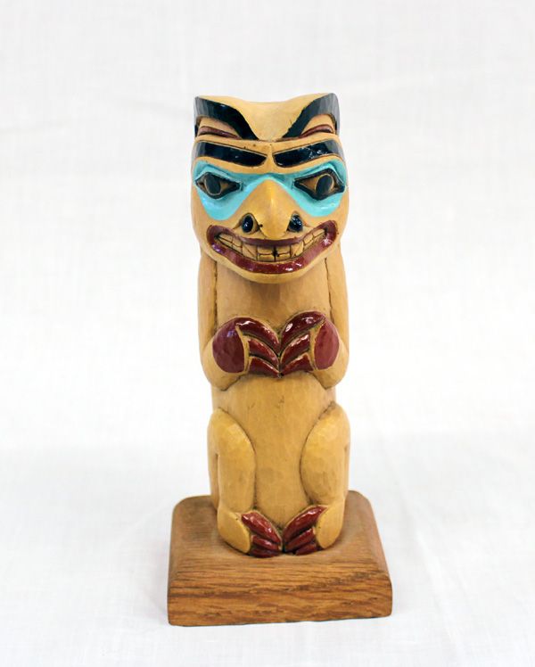 1990 Northwest Coast Alaskan Totem Pole by Tlingit Carver Israel Shotridge, measures 7'' x 3'' x 2'' Israel Shotridge is one of Alaska's finest Tlingit carvers. He was born and raised in Ketchikan, Alaska in the heart of the Tongass National Forest which was named after his tribal ancestors; the Tongass Tribe (Taantakwaan), the Sea Lion people. Israel is a member of the Bear Clan, which in Tlingit is written as ''Teikweidee.'' Israel's Tlingit name, Kinstaadaal, means ''The Bear That's Standing Up.'' (shotridgestudios.com)