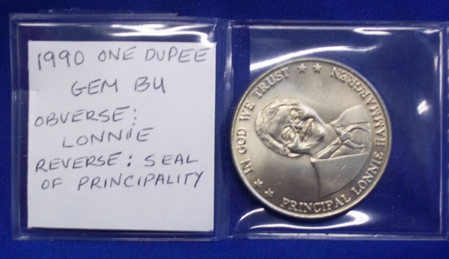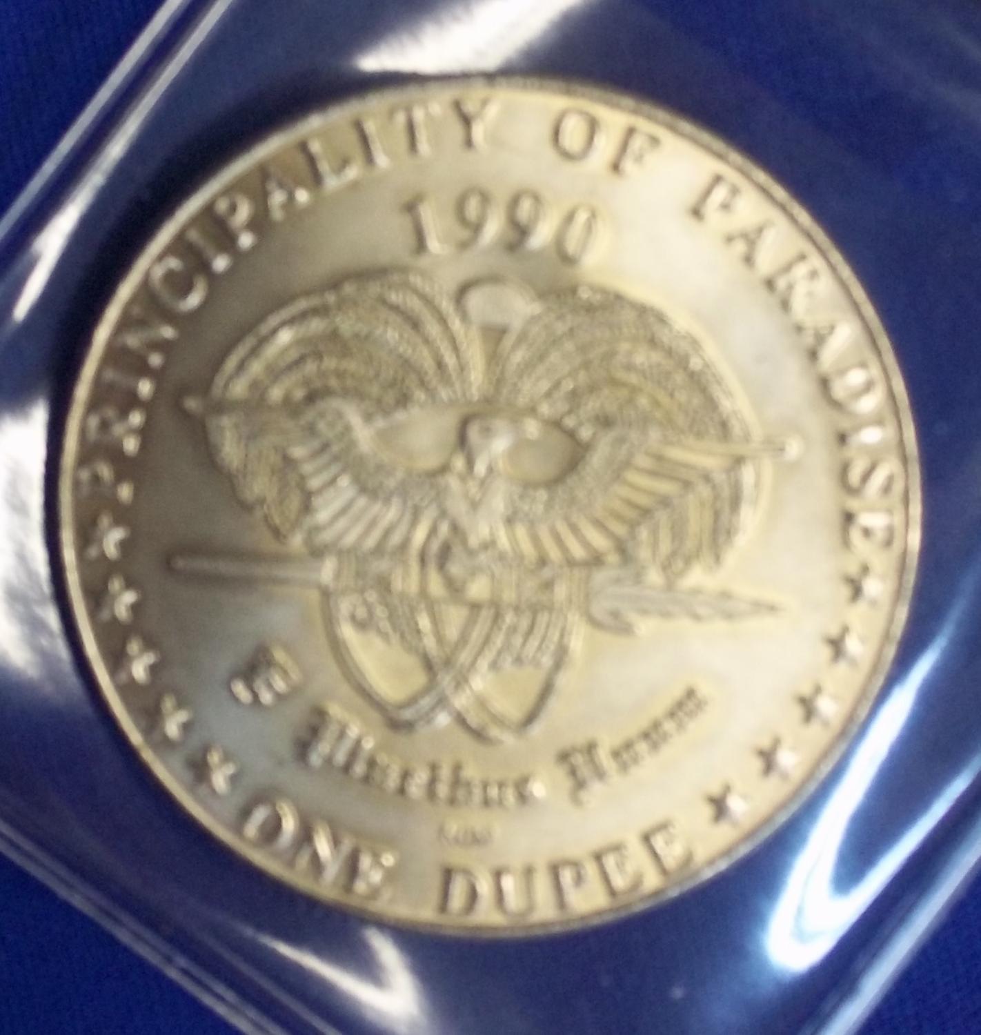 The Obverse: bust of Lonnie Hammargren. The reverse is a seal of Principality of Paradise. This coin was minted on an MGM token blank.
