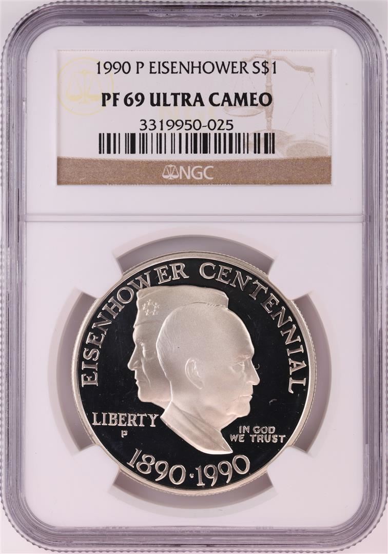 One 1990-P $1 Proof Eisenhower Commemorative Silver Dollar Coin NGC PF69 Ultra Cameo. NGC Certified.