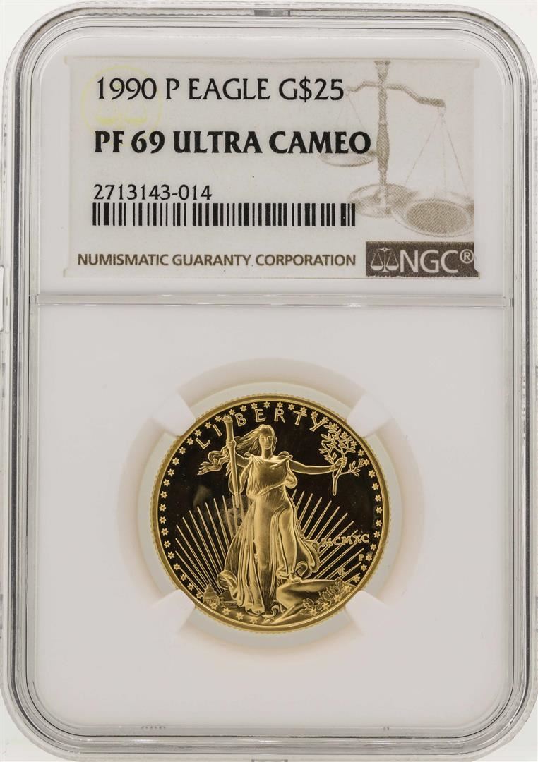 One 1990-P $25 American Gold Eagle Coin NGC PF69 Ultra Cameo. NGC Certified.