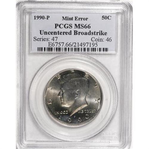 <B>1990-P 50C Kennedy Half Dollar--Uncentered Broadstrike--MS66 PCGS.</B></I><BR><BR><B>Coin Engraver:</B> Gilroy Roberts and Frank Gasparro<BR><BR><b>Shipping:</b> Coins & Currency (<a target="_blank" href="http://www.heritageauctions.com/common/shipping.php">view shipping information</a>)