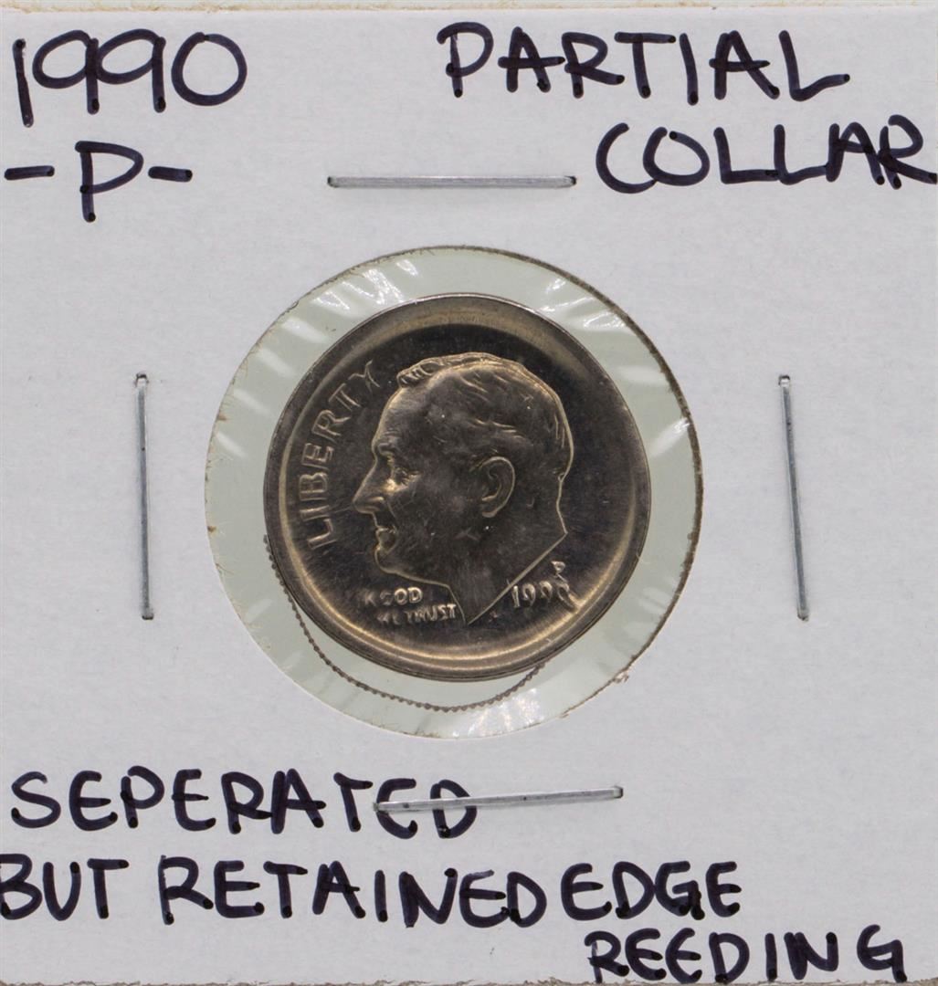 One 1990-P Partial Collar w/ Separated & Retained Edge Reeding Roosevelt Dime ERROR Coin.