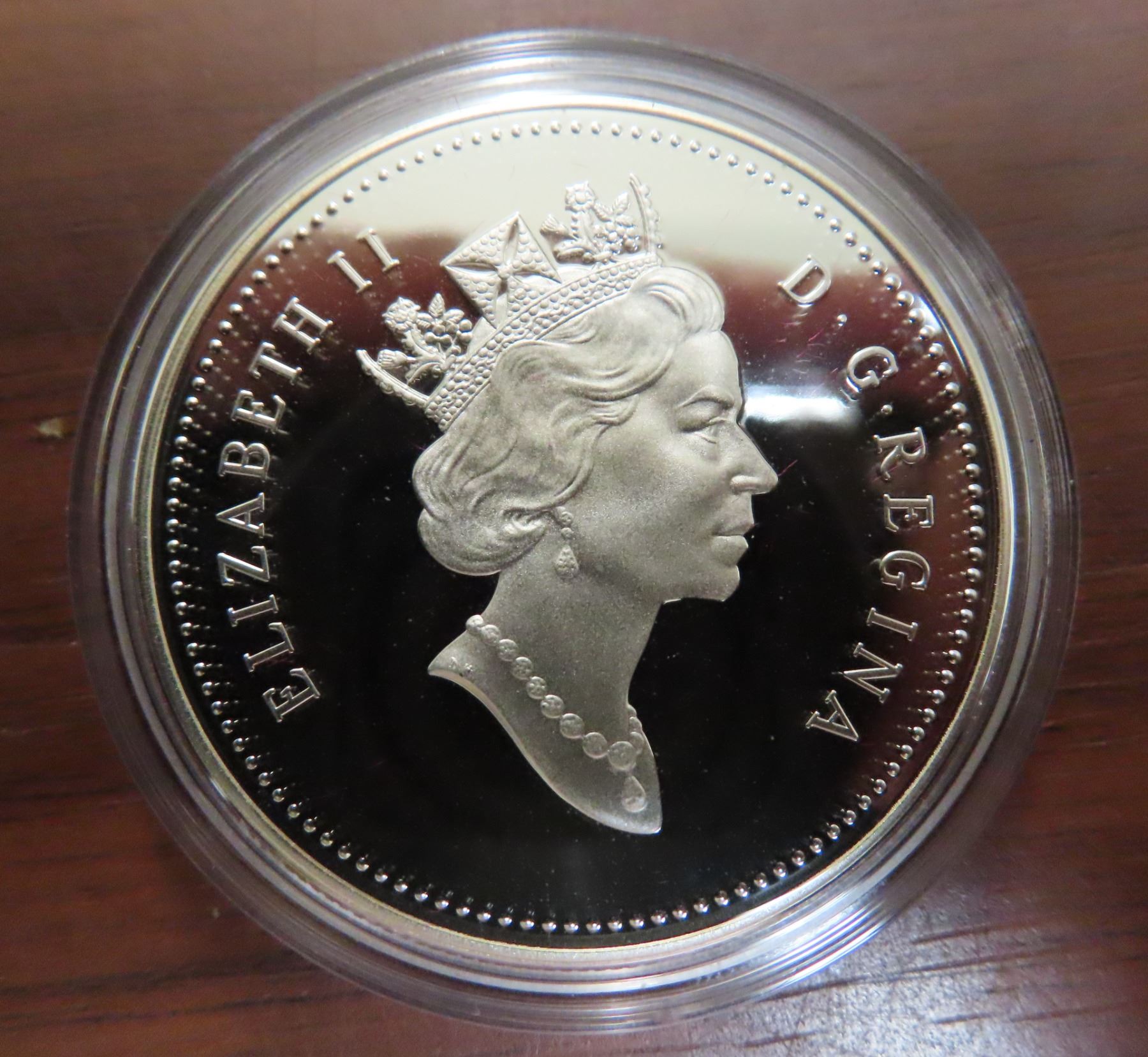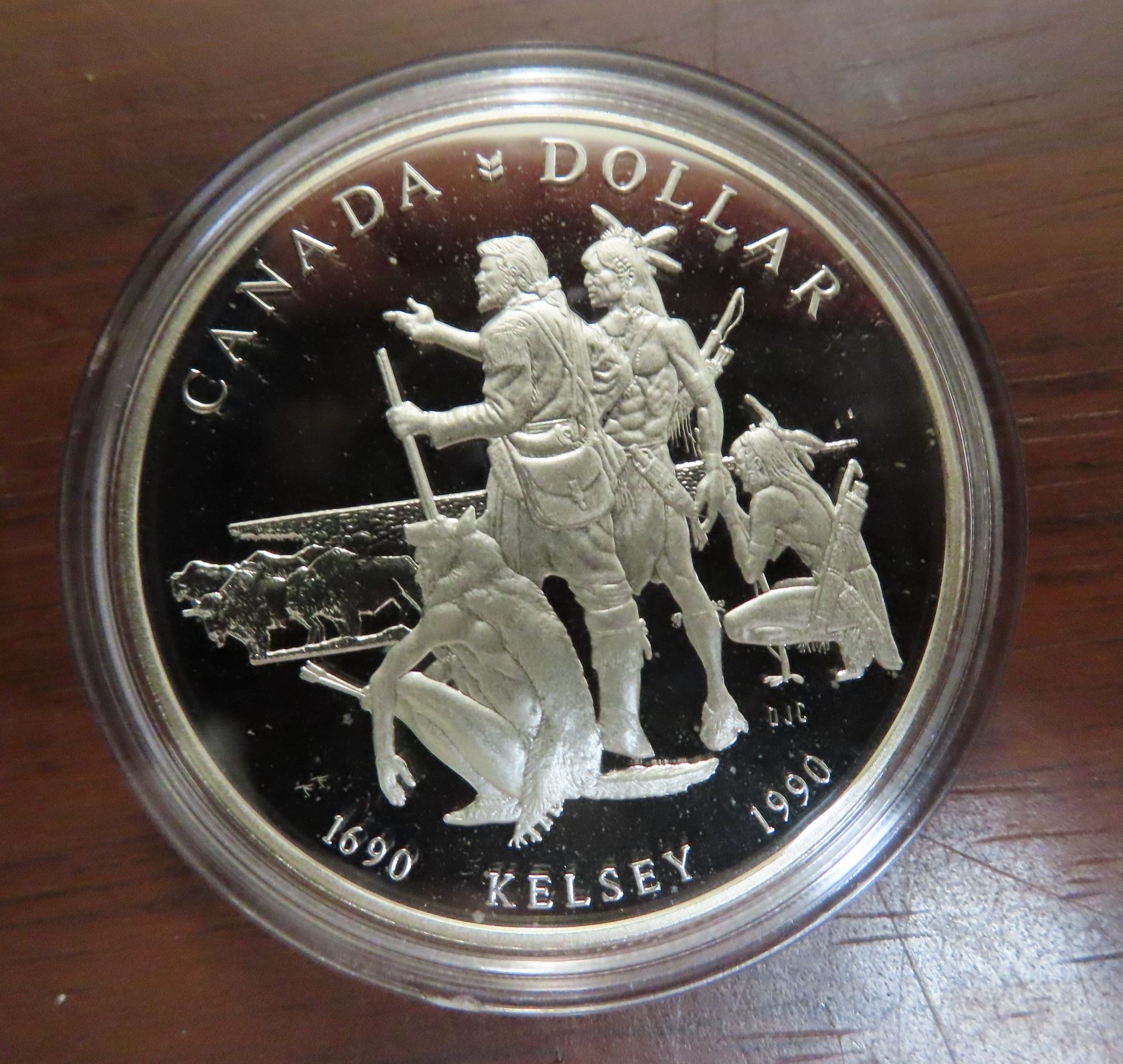 1990 Proof Silver Dollar. Commemorates the 300th Anniversary of HBC fur trader & explorer Henry Kelsey, who explored the Canadian West. Housed in its original Royal Canadian Mint case of issue. Bright White.