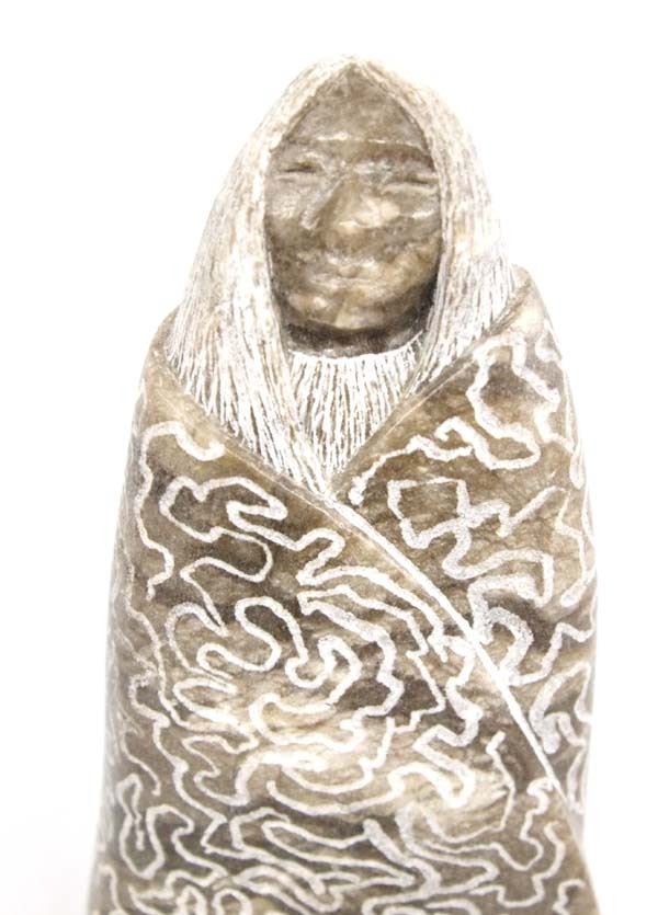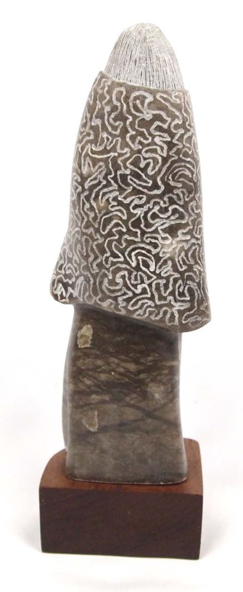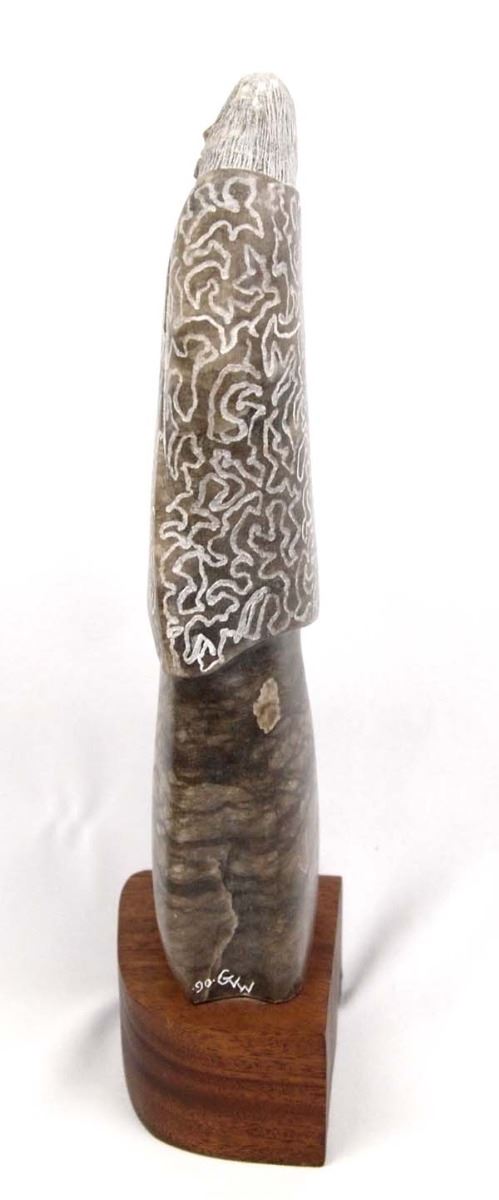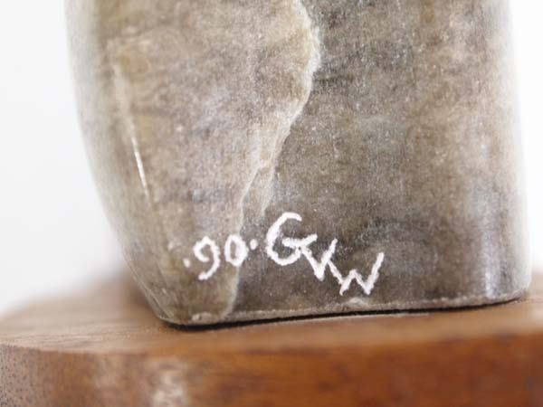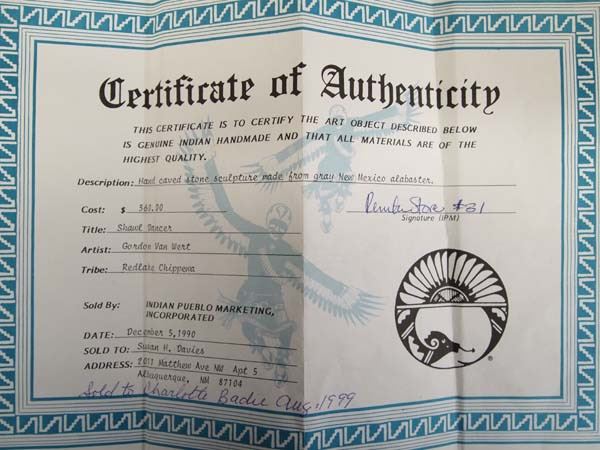 1990 Native American Redlake Chippewa Stone Sculpture ''Shawl Dancer'' by Gorgon Van Wert, measures 14''H, signed by artist and on wooden base, made of New Mexico Gray Alabaster, comes with COA, FYI: ''Synthesizing over 40 years of experience, centuries of Ojibwe art traditions and modern sculpting techniques, Gordon Van Wert is a recognized master in his field. A former student of Allan Houser at the Institute of American Indian Arts in Santa Fe, Van Wert has risen to his own notoriety and accolades. His Ojibwe art sculptures are much sought after pieces. Many of them are held in museums and the private collections of notable collectors including Robert Redford, Kurt Russel and Ted Danson. Beginning in the 1970's, Van Wert has sculpted hundreds of pieces over the years, developing his technique and style. Despite a stroke in the early 2000's, Van Wert continues to create exemplary pieces of Ojibwe art. After the stroke he used his sculpting as therapy, adapting his techniques to include a pneumatic chisel and learning to be mildly ambidextrous.''