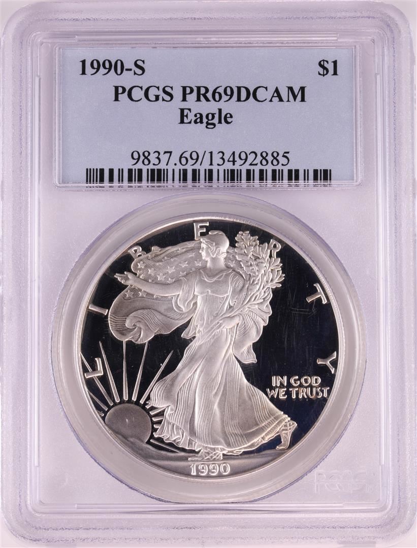 One 1990-S $1 Proof American Silver Eagle Coin PCGS PR69DCAM. PCGS Graded.