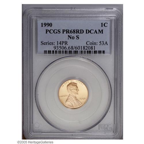 <B>1990-S<1C> No S PR68 Deep Cameo PCGS.</B></I> Fewer than two hundred examples are believed known of the 1990 No S cent. When this coin was produced, working dies were still finished in the branch mints. So, once the die was received in San Francisco, it was sandblasted, polished, and chromium plated without anyone noticing that the die lacked a mintmark. Bright, even cherry-red color covers each side, and the fields are very deeply mirrored with heavily frosted devices. Essentially a perfect coin. Population: 41 in PR68 Deep Cameo, 16 finer (10/05).