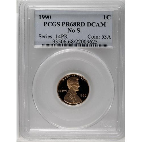<B>1990-S<1C> No S PR68 Deep Cameo Red PCGS.</B></I> One of the more popular errors of recent times and a very scarce coin so well preserved. Both sides reveal attractive copper-gold color. There are no specks or spots seen, and the Deep Cameo contrast is dramatic. Identifiable by two tiny planchet lumps, one below the D of UNITED, the other just past the F of OF. Population: 43 in 68, 16 finer (6/06).