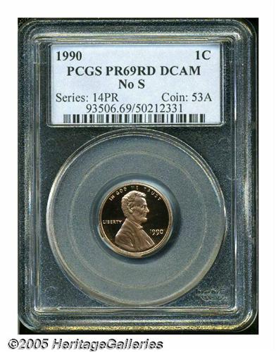 <B>1990-S<1C> No S PR69 Deep Cameo PCGS.</B></I> A simply spectacular example of this celebrated modern-day rarity. The cataloger of the presently-offered specimen spent several minutes with a 7X glass looking for even the most trivial defect, and there was none to be found. The surfaces are fully brilliant, giving the piece the appearance of having just come from the dies a moment earlier. The devices are heavily frosted and the fields are glittering mirrors. Under magnification the fields have an "orange-peel" texture that is a characteristic of proof cents struck on copper-coated zinc planchets, a material which has been in exclusive use for the production of the one-cent denomination since 1982. The variety was produced when the die department at the Philadelphia Mint forgot to add an "S" mintmark to an otherwise normal obverse proof cent die, before shipping it to the San Francisco Mint. The quality control technicians failed to notice the missing mintmark until some of the resulting coins had already been struck and incorporated into Proof sets. Evidently only a relatively small number escaped into the hands of collectors, and survivors rank among the most highly-valued varieties produced at the San Francisco Mint during the latter half of the 20th century.