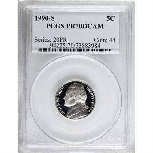 <B>1990-S 5C PR70 Deep Cameo PCGS.</B></I> PCGS Population (59/0). NGC Census: (38/0). Numismedia Wsl. Price for NGC/PCGS coin in PR70: $180. (#94225)<BR><BR><b>Shipping:</b> Coins & Currency (<a target="_blank" href="http://www.heritageauctions.com/common/shipping.php">view shipping information</a>\)