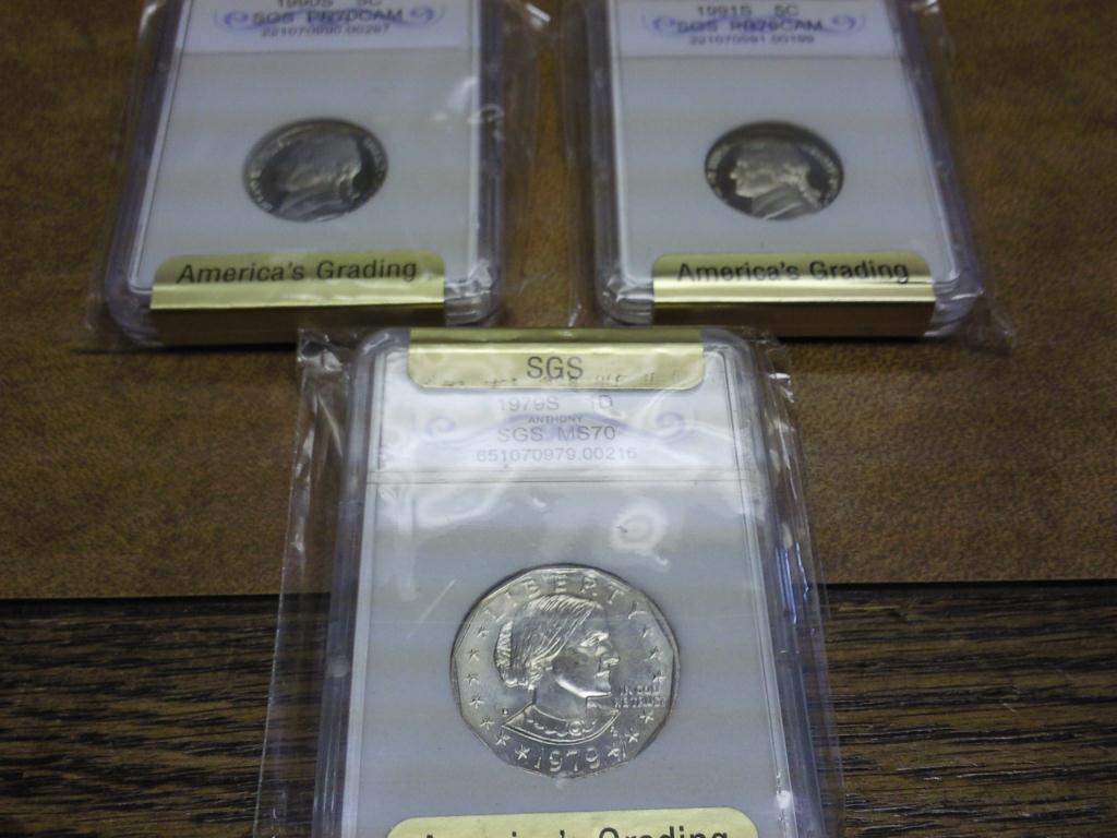 THE NICKELS ARS SGS PR70CAM AND THE SBA DOLLAR IS SGS MS70, 3 SLABS
