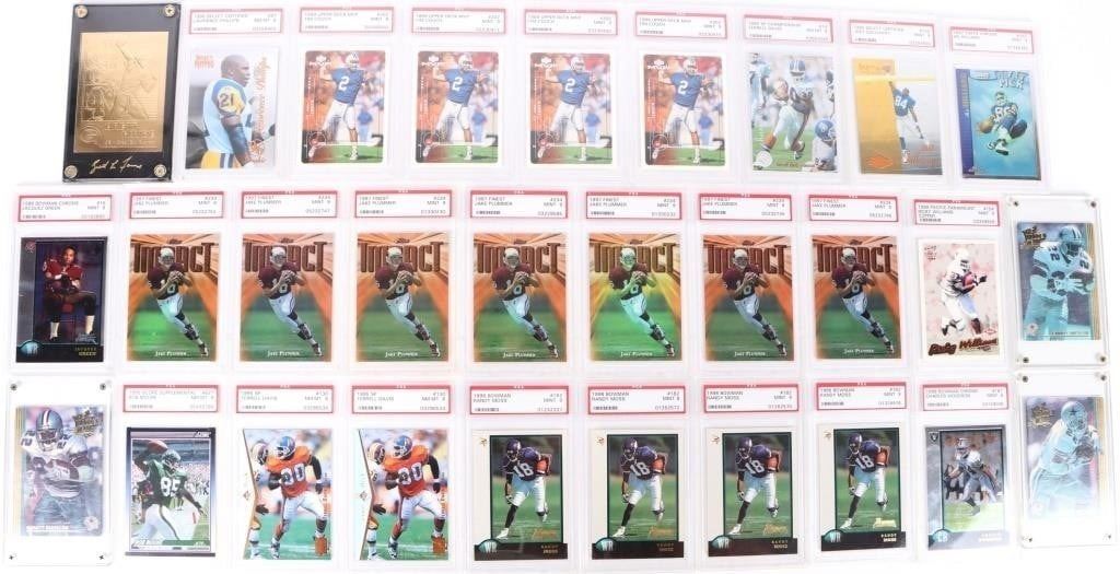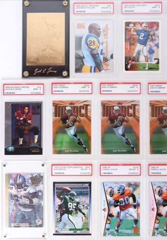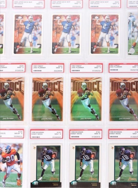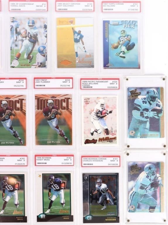 1990's graded collectible football cards to include: four 1998 Bowman Randy Moss #182 mint 9.0, seven 1997 Finest Jake Plummer #234 mint 9.0, two 1995 SP Terrell Davis #130 mint 8.0, 1995 Select Certified Joey Galloway #135 mint 9.0, 1995 SP Championship Terrell Davis #14 mint 8.0, four 1999 Upper Deck MVP Tim Couch #202 mint 9.0, 1997 Topps Chrome Ike Hilliard #161 mint 9.0, 1999 Pacific Paramount Ricky Williams Copper #154 mint 9.0, 1998 Bowman Chrome Charles Woodson #181 mint 9.0, 1998 Bowman Chrome Jacquez Green #16 mint 9.0, 1990 Score Supplemental Rob Moore #62T 8.0, and 1996 Select Certified Lawrence Philips #97 8.0. gold plated Brett Favre, and three 1993 Action Packed Prototype Emmitt Smith-EB.