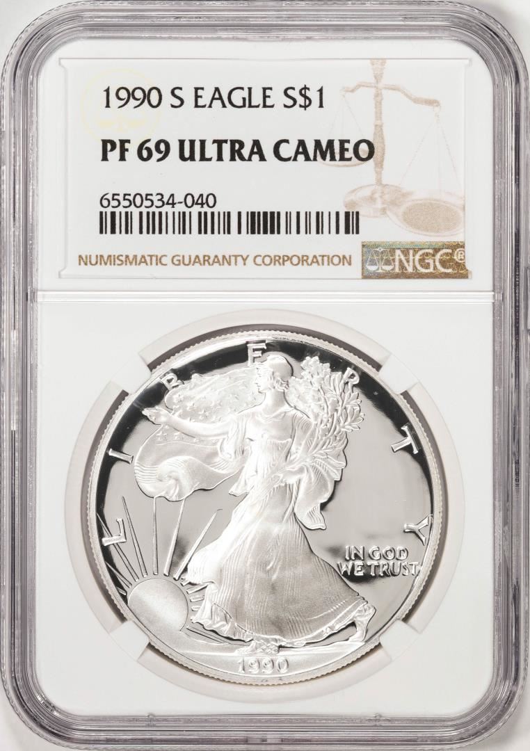 One 1990-S Proof $1 American Silver Eagle Coin NGC PF69 Ultra Cameo. NGC Certified.