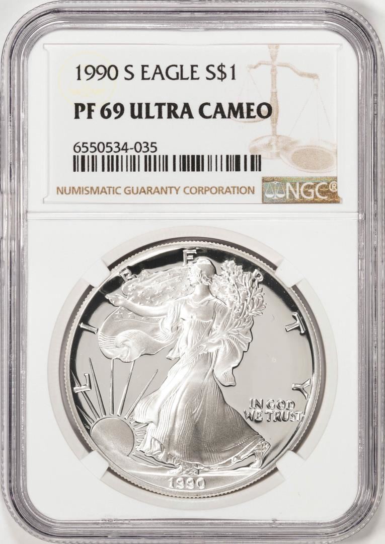 One 1990-S Proof $1 American Silver Eagle Coin NGC PF69 Ultra Cameo. NGC Certified.