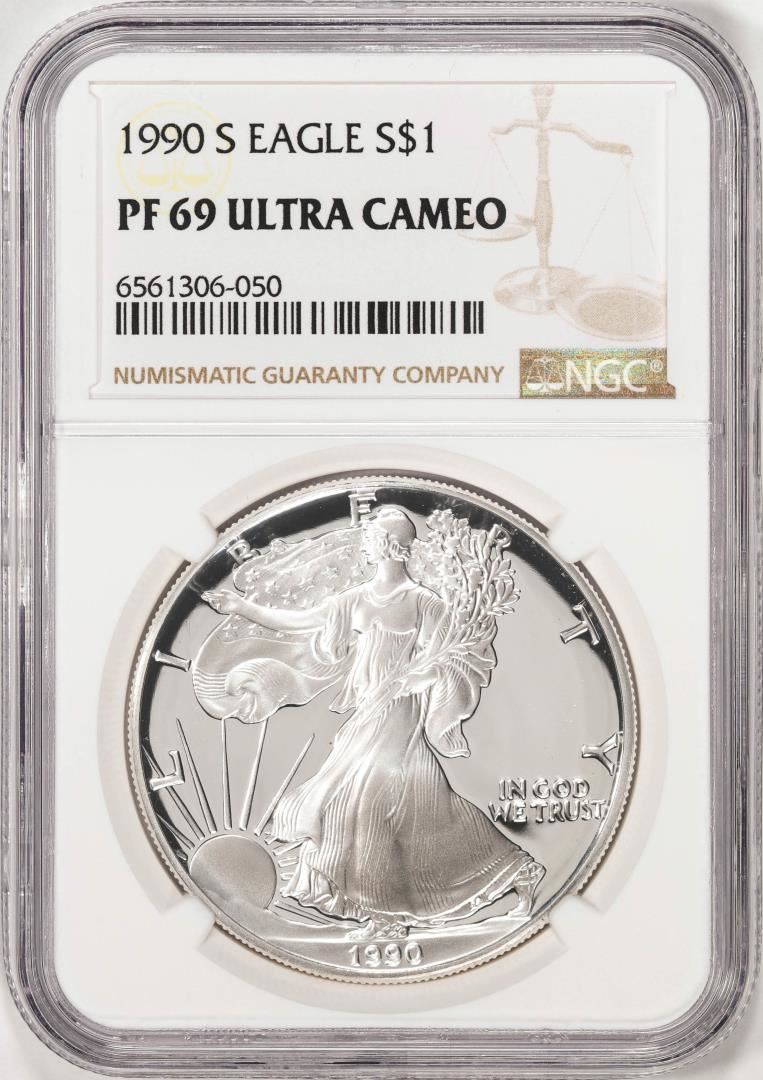 One 1990-S Proof $1 American Silver Eagle Coin NGC PF69 Ultra Cameo. NGC Certified.
