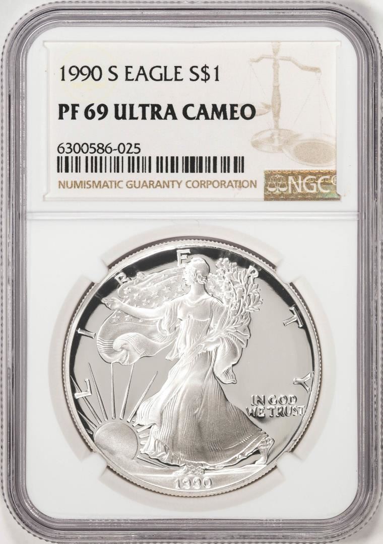 One 1990-S Proof $1 American Silver Eagle Coin NGC PF69 Ultra Cameo. NGC Certified.