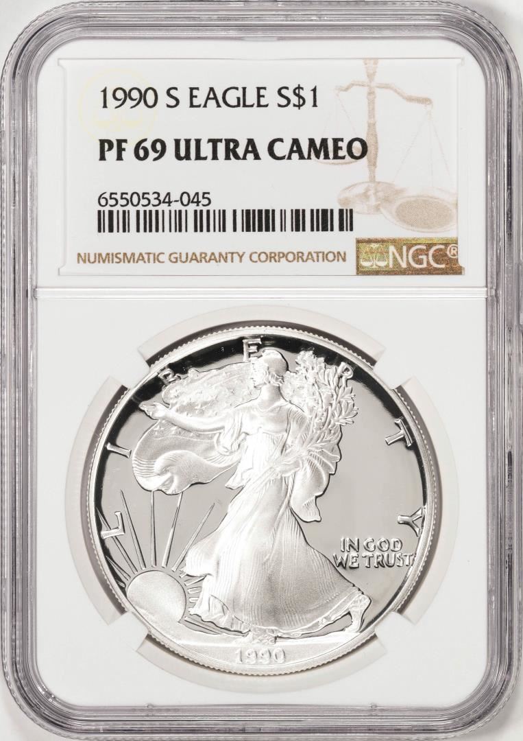 One 1990-S Proof $1 American Silver Eagle Coin NGC PF69 Ultra Cameo. NGC Certified.