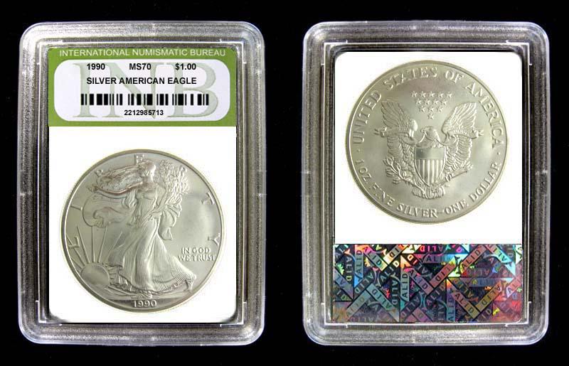 1990 SLABBED SILVER AMERICAN EAGLE HIGHEST GRADE INB GRADED MS70 - You may not receive the exact coin shown, but you will receive one of the same or better quality.