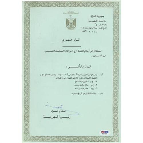 <B>1990 Sadam Hussein Signed Document.</B></I> In Arabic, one page, 8.5 x 12, 1990. An untranslated typed document bearing a printed eagle with shield device at top in gold ink, and gold ink decorative border, and signed in black ink at lower left. File holes to right margin, otherwise very fine condition. PSA/DNA COA. <BR><BR><b>Shipping:</b> Flat Material, Small (<a target="_blank" href="http://www.heritageauctions.com/common/shipping.php">view shipping information</a>)