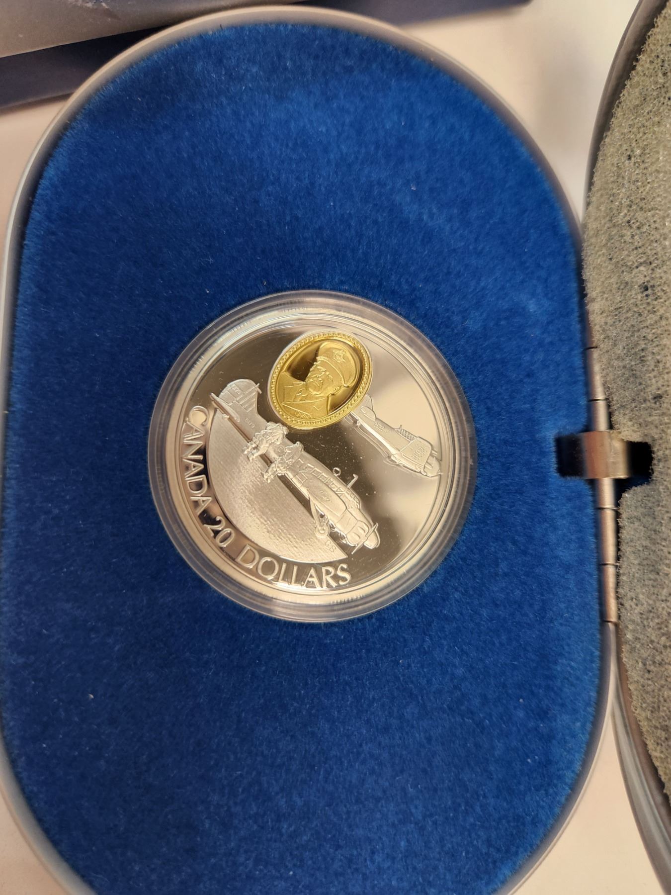 1990 The Anson and the Harvard $20. The first coin in the Canadian Powered Flight Aviation Commemorative $20 series. Both airplanes were vital trainer aircraft during World War II. Sterling Silver with 24kt gold Cameo. Bright White. Housed in its original case and box of issue. Nice.