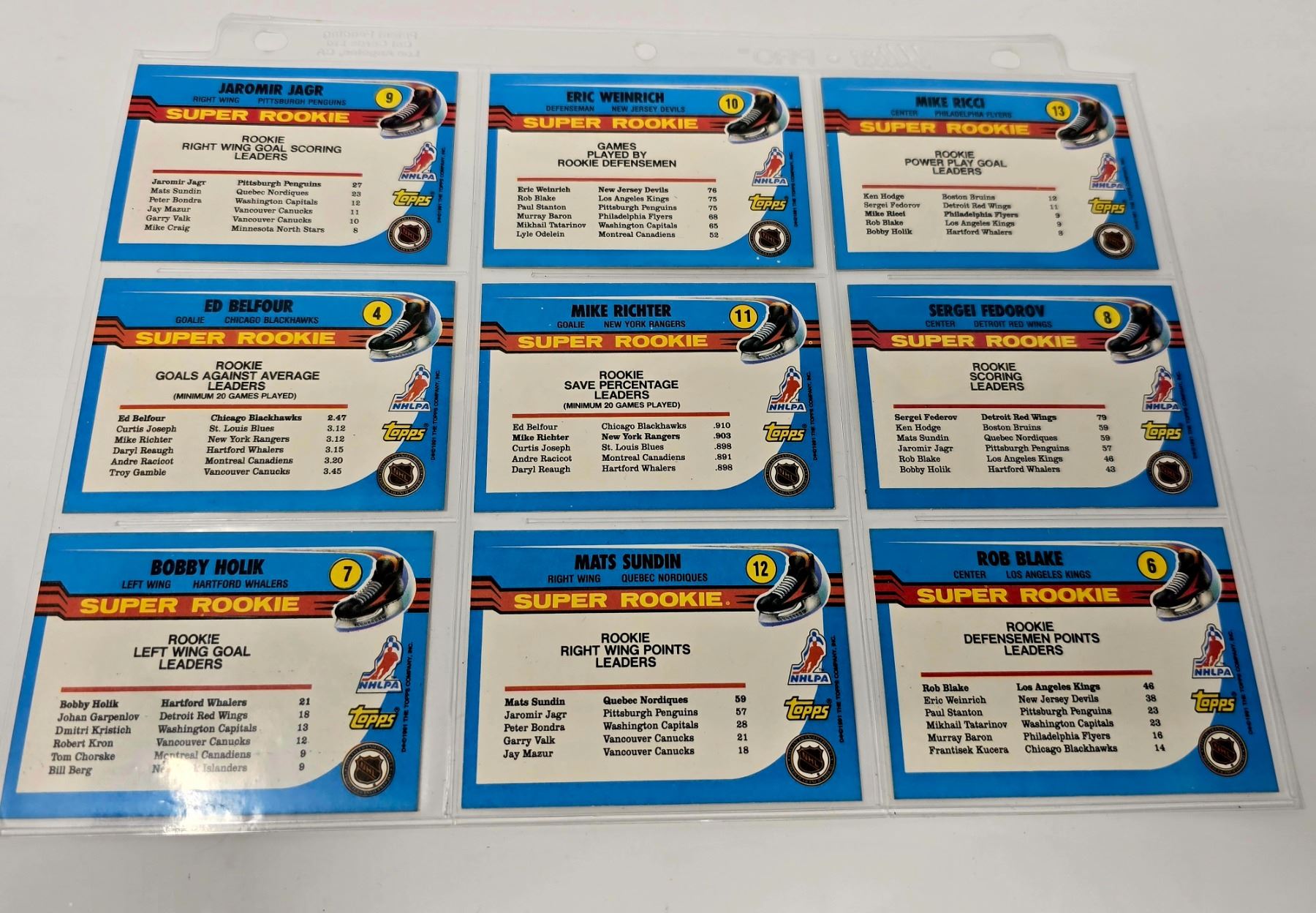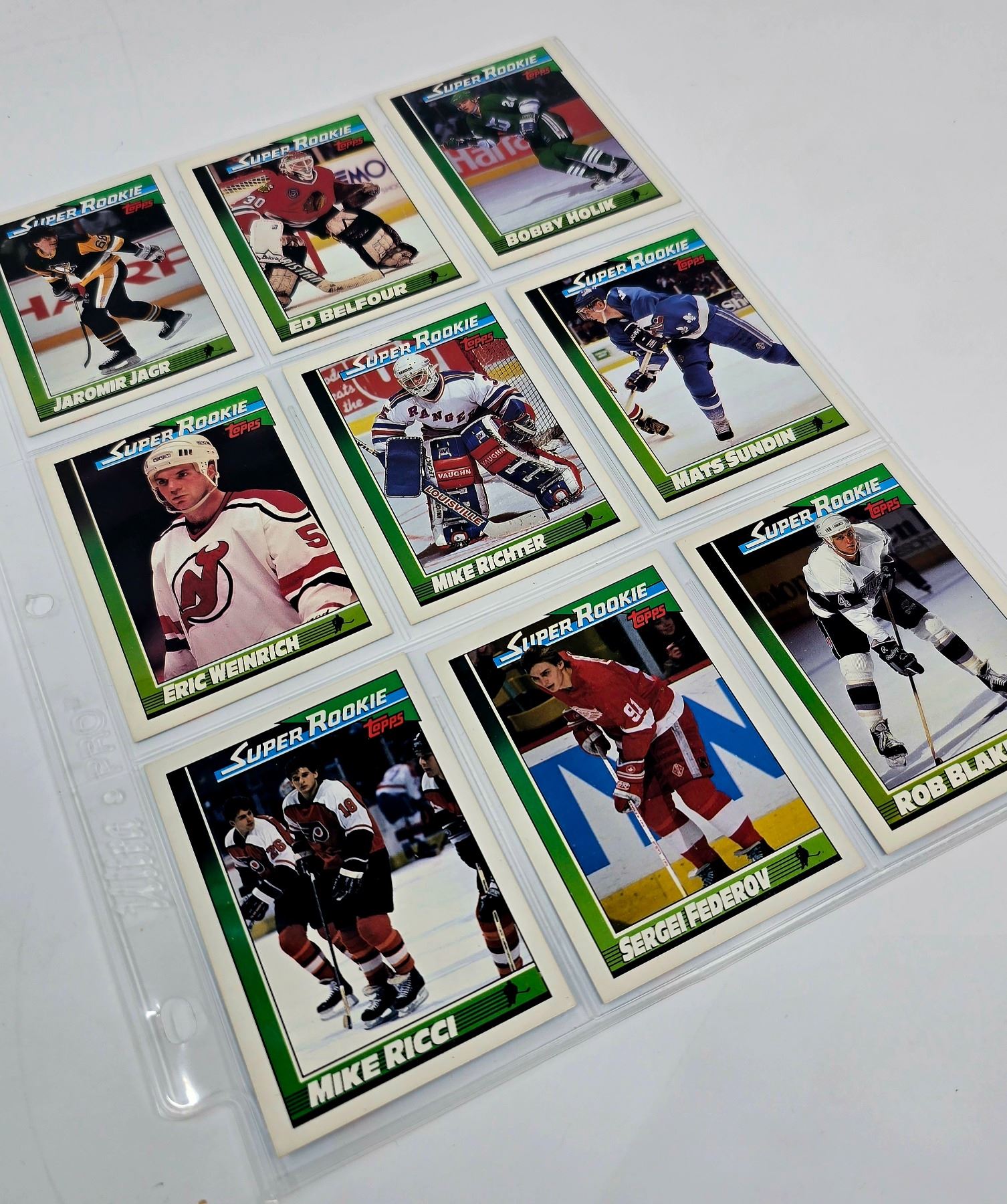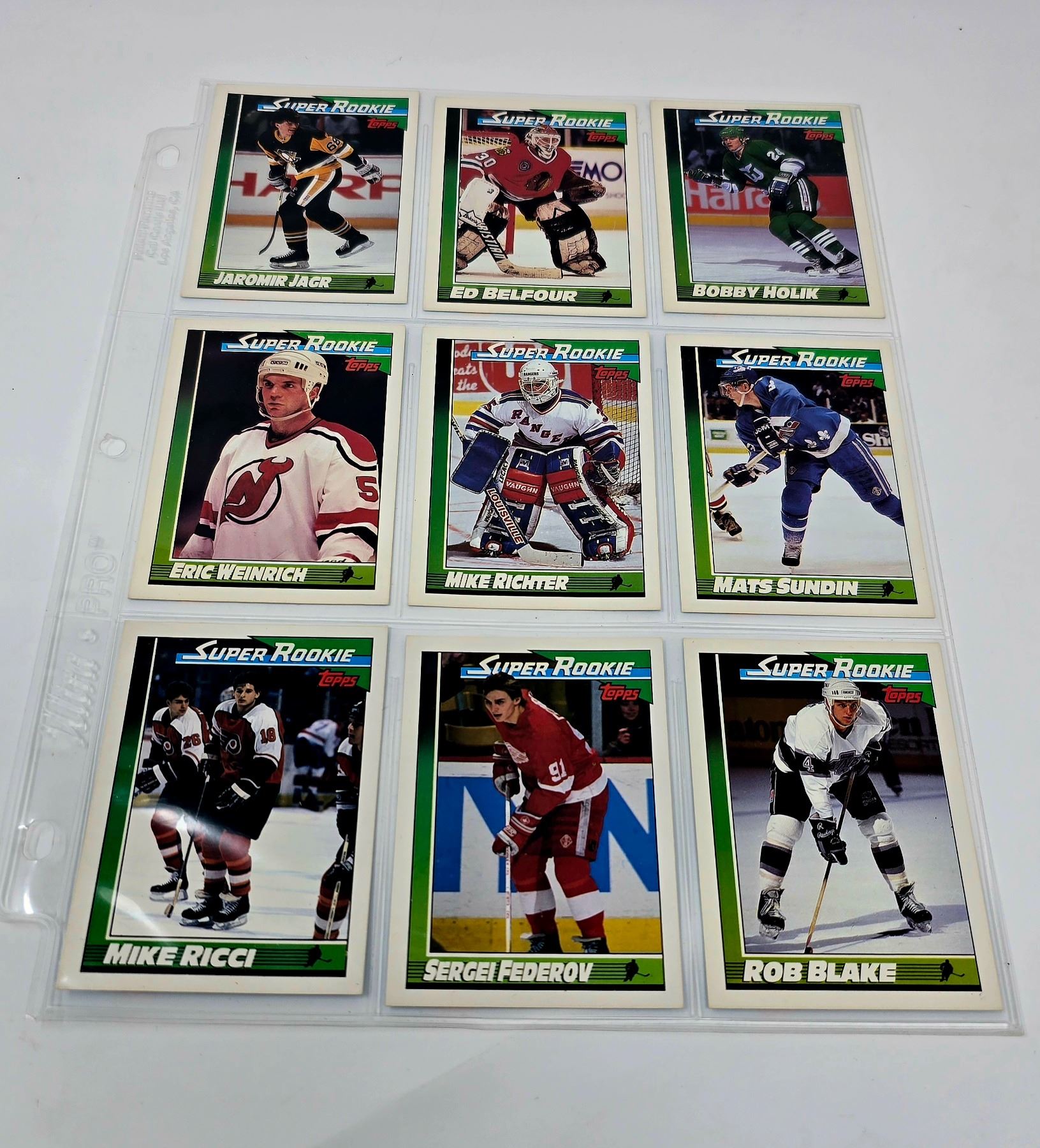 9-card Topps Super Rookie lot featuring Jagr, Belfour, Fedorov, and more. Strong condition early 90s NHL stars.