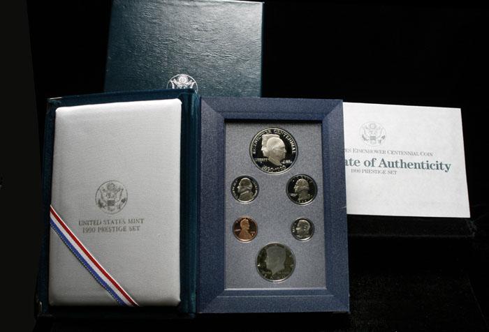 Contains the 1990 Eisenhower 90% silver US Silver Dollar plus the Traditional 5 pieces 1990 Proof Set. Includes all the original packaging and the COA. Estimated Value $100