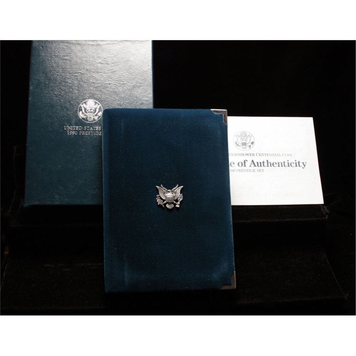 Contains the 1990 Eisenhower 90% silver US Silver Dollar plus the Traditional 5 pieces 1990 Proof Set. Includes all the original packaging and the COA. Note* The silver Dollar alone has .7736 Oz. of pure silver Estimated Value $90