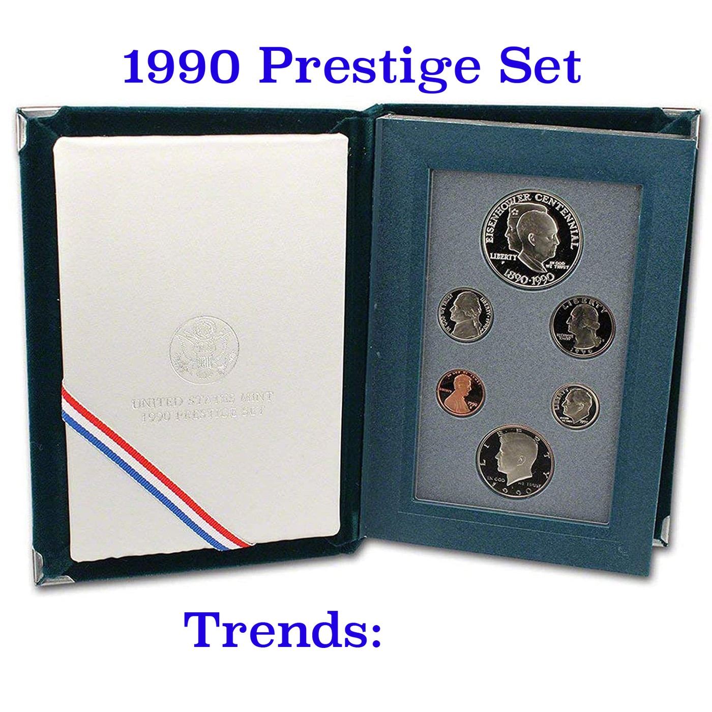 1990 United States Mint Prestige Proof Set. Contains the 1990 Eisenhower 90% silver US Silver Dollar plus the Traditional 5 pieces 1990 Proof Set. Includes all the original packaging and the COA. About 1oz Of Silver
