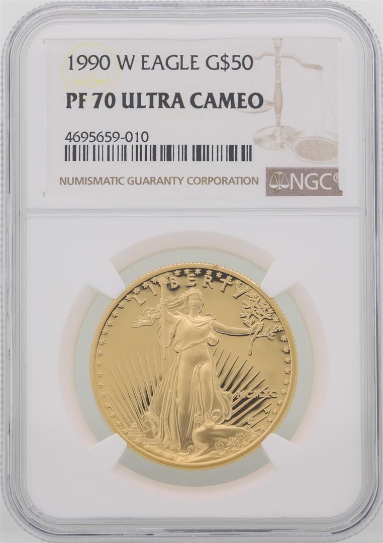 One 1990-W $50 American Gold Eagle Coin NGC PF70 Ultra Cameo. NGC Certified.