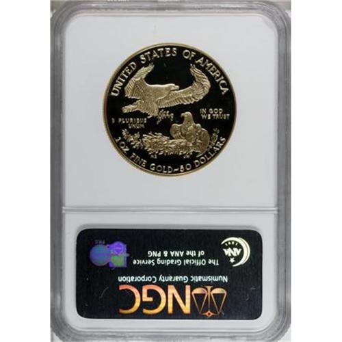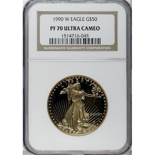 <B>1990-W G$50 One-Ounce Gold Eagle PR70 Deep Cameo NGC.</B></I> NGC Census: (463/0). PCGS Population (43/0). Mintage: 62,401. Numismedia Wsl. Price for NGC/PCGS coin in PR70: $1,200. (#9845)<BR><BR><b>Shipping:</b> Coins & Currency (<a target="_blank" href="http://www.heritageauctions.com/common/shipping.php">view shipping information</a>)