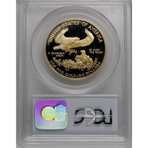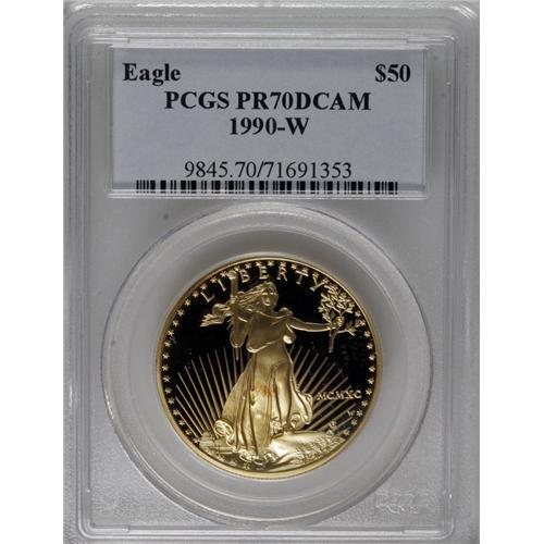 <B>1990-W G$50 One-Ounce Gold Eagle PR70 Deep Cameo PCGS.</B></I> This orange-gold piece has flashy, deep mirrors and rich frost on the meticulously struck devices. PCGS has acknowledged just 40 examples in this grade (2/07).<BR><BR><b>Shipping:</b> Coins & Currency (<a target="_blank" href="http://www.heritageauctions.com/common/shipping.php">view shipping information</a>)