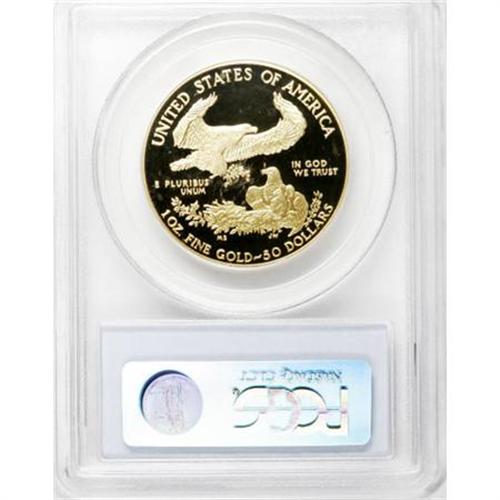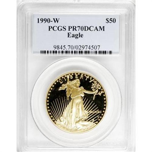 <B>1990-W G$50 One-Ounce Gold Eagle PR70 Deep Cameo PCGS.</B></I> A gleaming and deeply contrasted American Eagle coin, one ounce of pure proof perfection. This specimen is one of just 43 assigned the ultimate grade by PCGS (1/08).<BR><BR><b>Shipping:</b> Coins & Currency (<a target="_blank" href="http://www.heritageauctions.com/common/shipping.php">view shipping information</a>)