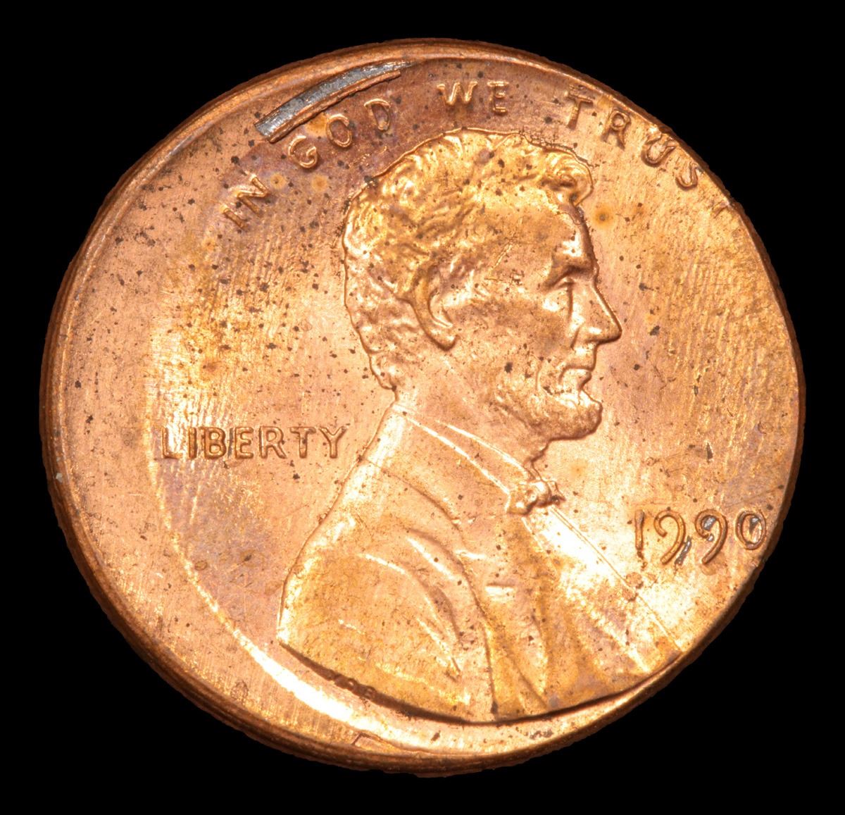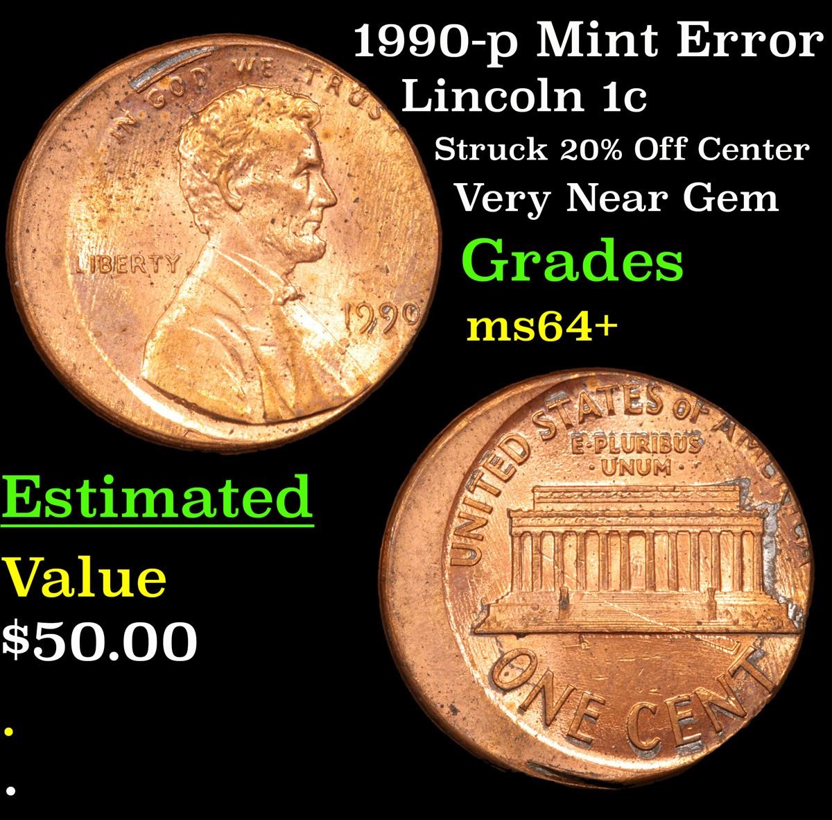 1990-p Mint Error Struck 20% Off Center Very Near Gem Lincoln Cent 1c Grades Choice+ Unc.