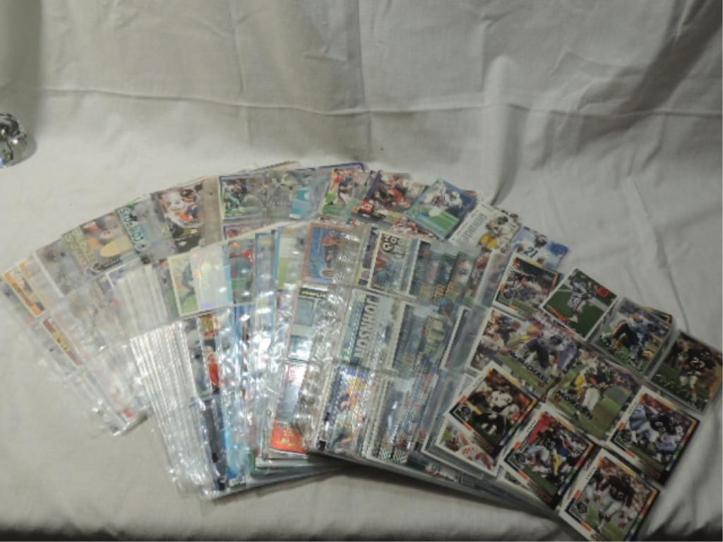 LARGE BOX 1990's ASSORTED FOOTBALL PLAYERS CARDS IN BINDER SHEETS. AS SHOWN. SEE PICTURE FOR DETAILS.