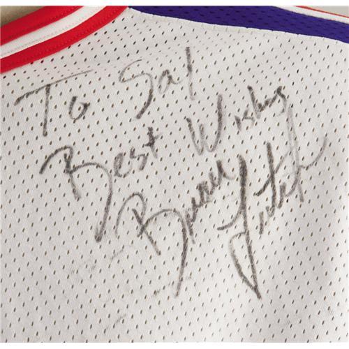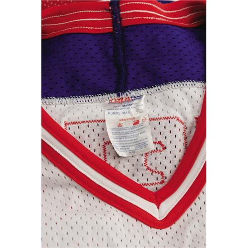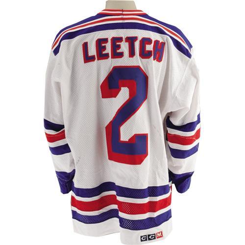 <B>1990's Brian Leetch Game Worn Jersey.</B></I> Number seventy-one on The Hockey News' list of the 100 Greatest Hockey Players of All Time, Leetch put excellent wear into this white mesh gamer around the time of the New York Rangers' glorious 1994 Stanley Cup Championship. Stick and puck marks are scattered about the exterior, and the softening of the collar tag suggests nice, sweaty use. Red and white tackle twill spells "Rangers" in stairstep pattern across the chest, with "Leetch 2" on verso. Number "2" appears again on each sleeve. "CCM" manufacturer's flap tag inside collar has handwritten size notation of "52." Fight strap affixed at interior rear tail. A 10/10 black sharpie inscription on upper chest reads, "To Sal, Best Wishes, Brian Leetch." With his Hall of Fame induction a foregone conclusion, smart investors are jumping at every chance to own top quality gear like this. <I>LOA from Milt Byron. LOA from James Spence Authentication. LOA from PSA/DNA.</B></I><BR><BR><b>Shipping:</b> Clothing, Costumes & Jerseys (<a target="_blank" href="http://www.heritageauctions.com/common/shipping.php">view shipping information</a>)
