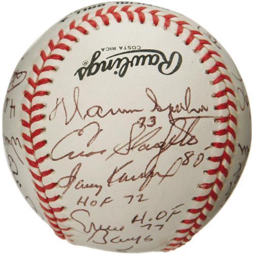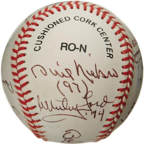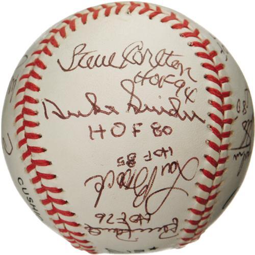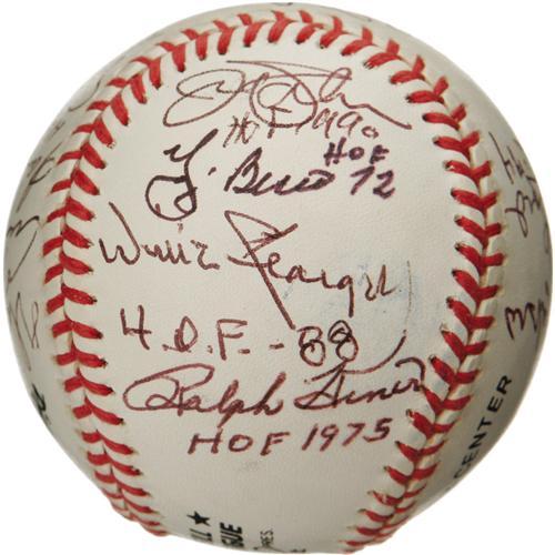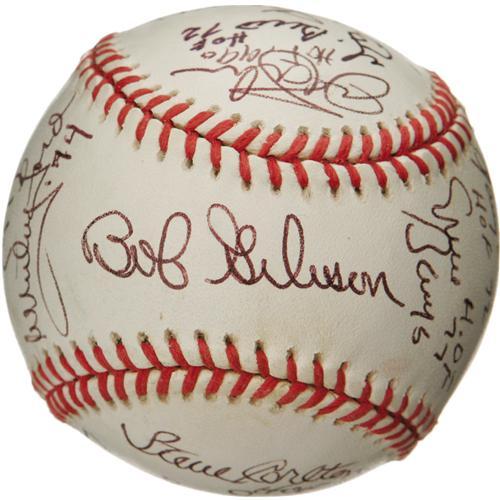 <B>1990's Hall of Famers Multi-Signed Baseball.</B></I> Unique autographed orb sets itself apart from the pack with the addition of notations in each legend's hand announcing the year of his induction. Only the sweet spot donation from Bob Gibson fails to keep the theme, with Carlton, Snider, Brock, Roberts, Kiner, Stargell, Berra, Palmer, Spahn, Slaughter, Koufax, Banks, Niekro and Ford each noting his year of honor. The black ink signatures are uniformly 9/10 or better, and the ONL (White) ball is free of any noteworthy defect. Still some room to add more, making this a great "project piece" for autograph hounds. <I>LOA from PSA/DNA. LOA from James Spence Authentication.</B></I><BR><BR><b>Shipping:</b> Balls, Pucks, etc., Small (<a target="_blank" href="http://www.heritageauctions.com/common/shipping.php">view shipping information</a>)