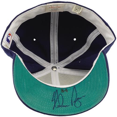 <B>1990's Nolan Ryan Game Worn Cap.</B></I> A perfect complement to the Ryan game worn Texas Rangers jersey also found within this auction is presented here, straight from the head of baseball's premier strike out artist. The "New Era" cap offers MLB and size "7 3/8" tagging in the headband, which is moderately stained with Hall of Fame sweat. Number "34" appears in marker under the visor, joined by a 10/10 blue sharpie autograph from the man himself. An important keepsake from the closing years of a long and storied career. <I>LOA from Lou Lampson. LOA from James Spence Authentication. LOA from PSA/DNA.</B></I><BR><BR><b>Shipping:</b> Miscellaneous Collectibles, Smal (<a target="_blank" href="http://www.heritageauctions.com/common/shipping.php">view shipping information</a>)