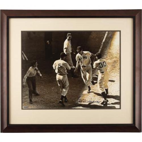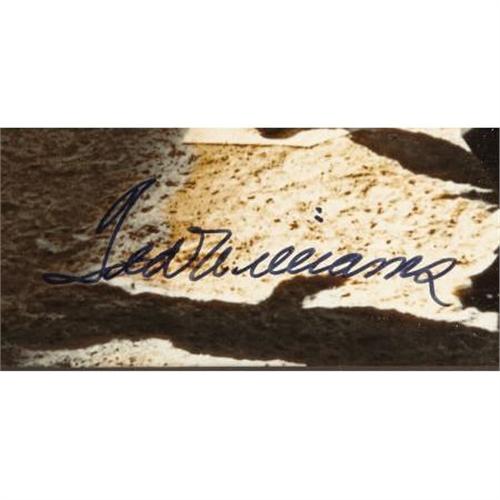 <B>1990's Ted Williams Signed UDA Oversized Photograph.</B></I> Great rivals are made temporary teammates and co-celebrants at the 1941 All-Star Game, as Joe DiMaggio waits to congratulate Ted Williams at home plate after the latter clubbed a three-run walk-off homer to convert a five to four bottom of the ninth deficit into a seven to five American League victory. This joyful image has been printed to 16x20" in size using a special photographic process mixing silver and golden hues, then signed in 10/10 blue sharpie by the hero of the day. Bottom left holds the UDA authenticating holographic sticker (matching paperwork unavailable), and the limited edition numbering "35/300" is penned at bottom right. Photo is matted and framed to final dimensions of 24x27.5". <I>LOA from PSA/DNA. LOA from James Spence Authentication.</B></I><BR><BR><b>Shipping:</b> Framed - with Glass, Small (<a target="_blank" href="http://www.heritageauctions.com/common/shipping.php">view shipping information</a>)