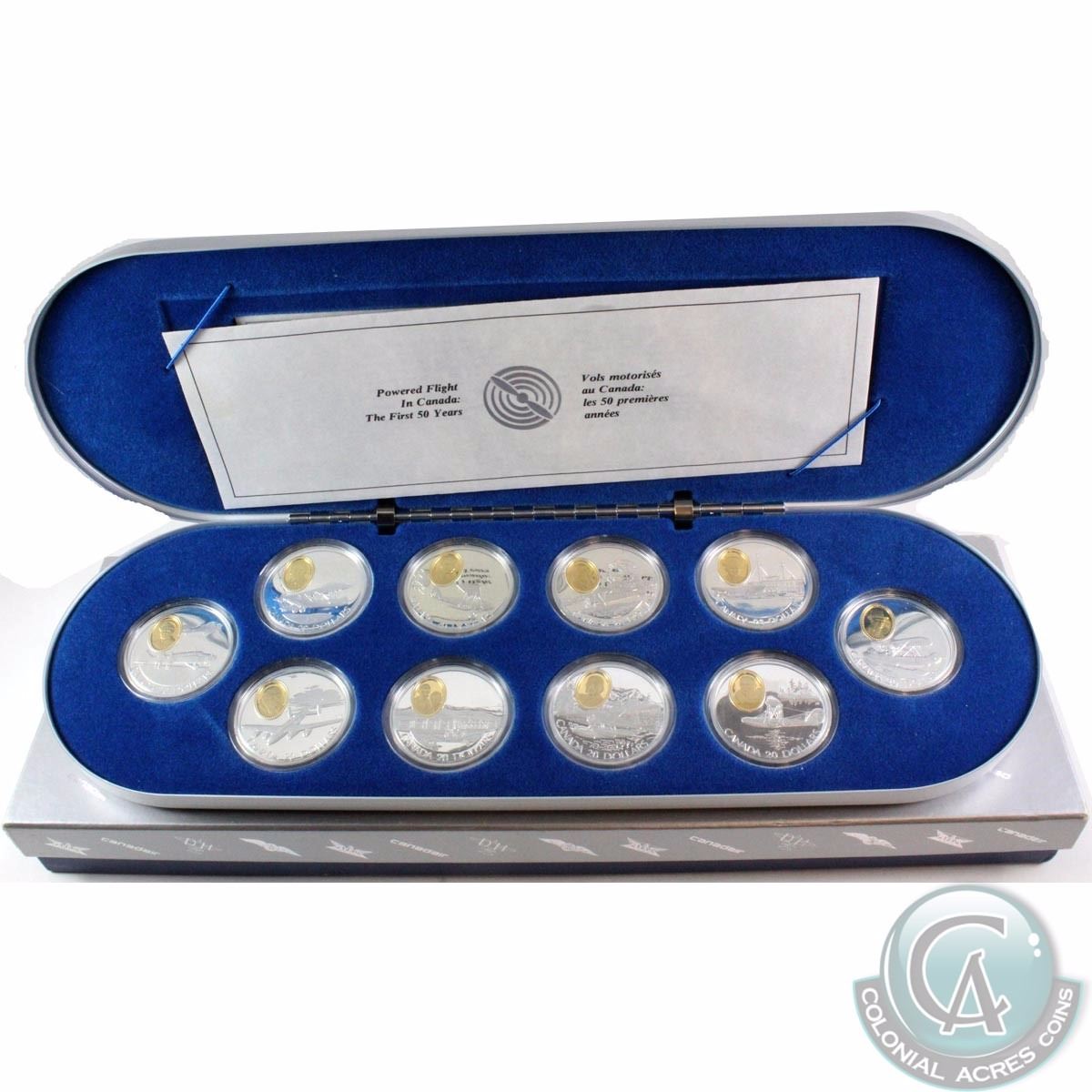 1990 to 1994 Canada Aviation sterling silver $20 Series One set Powered Flight in Canada; The First 50 Years Complete 10-coin Set (as is typical of this set, outer cardboard box is lightly worn) 10pcs