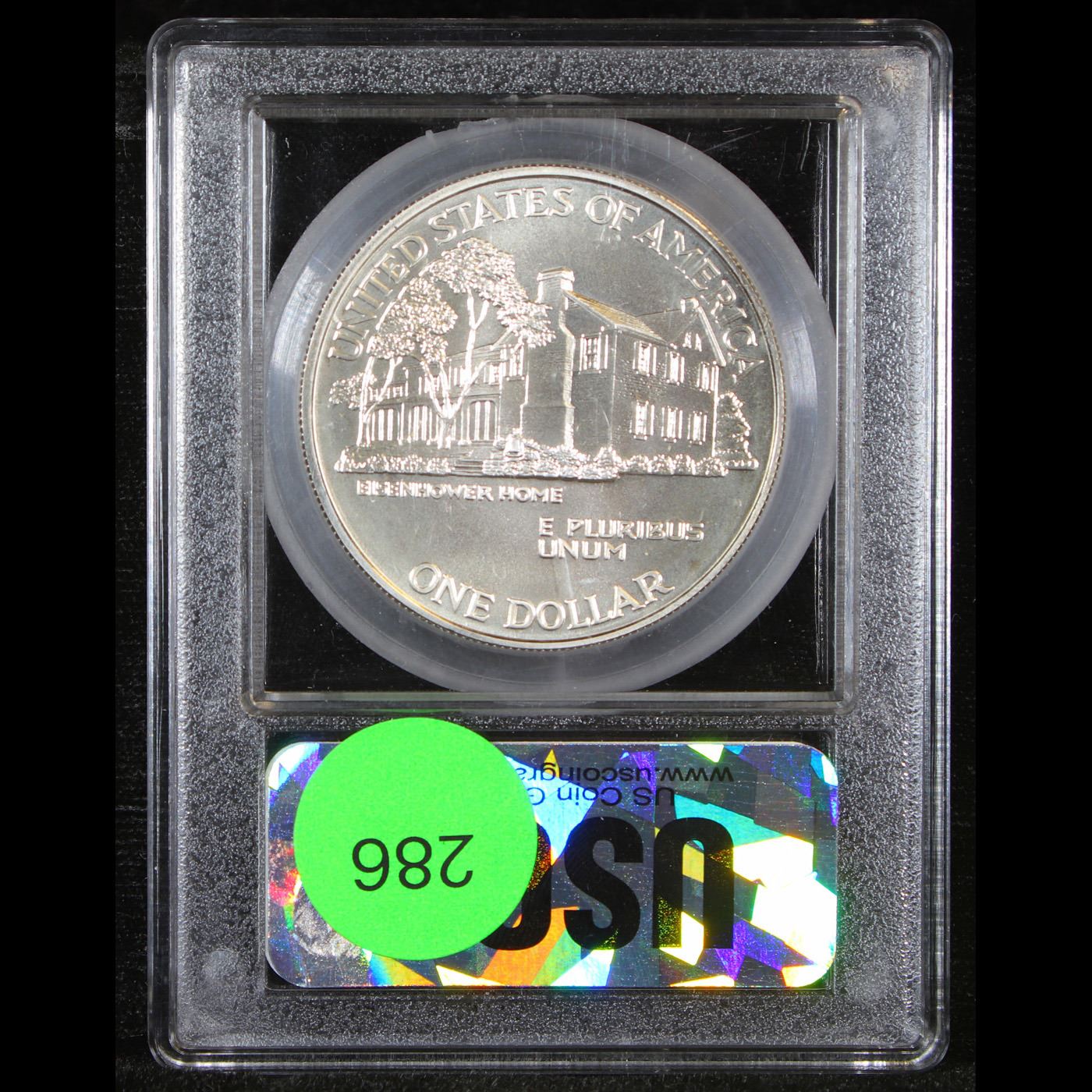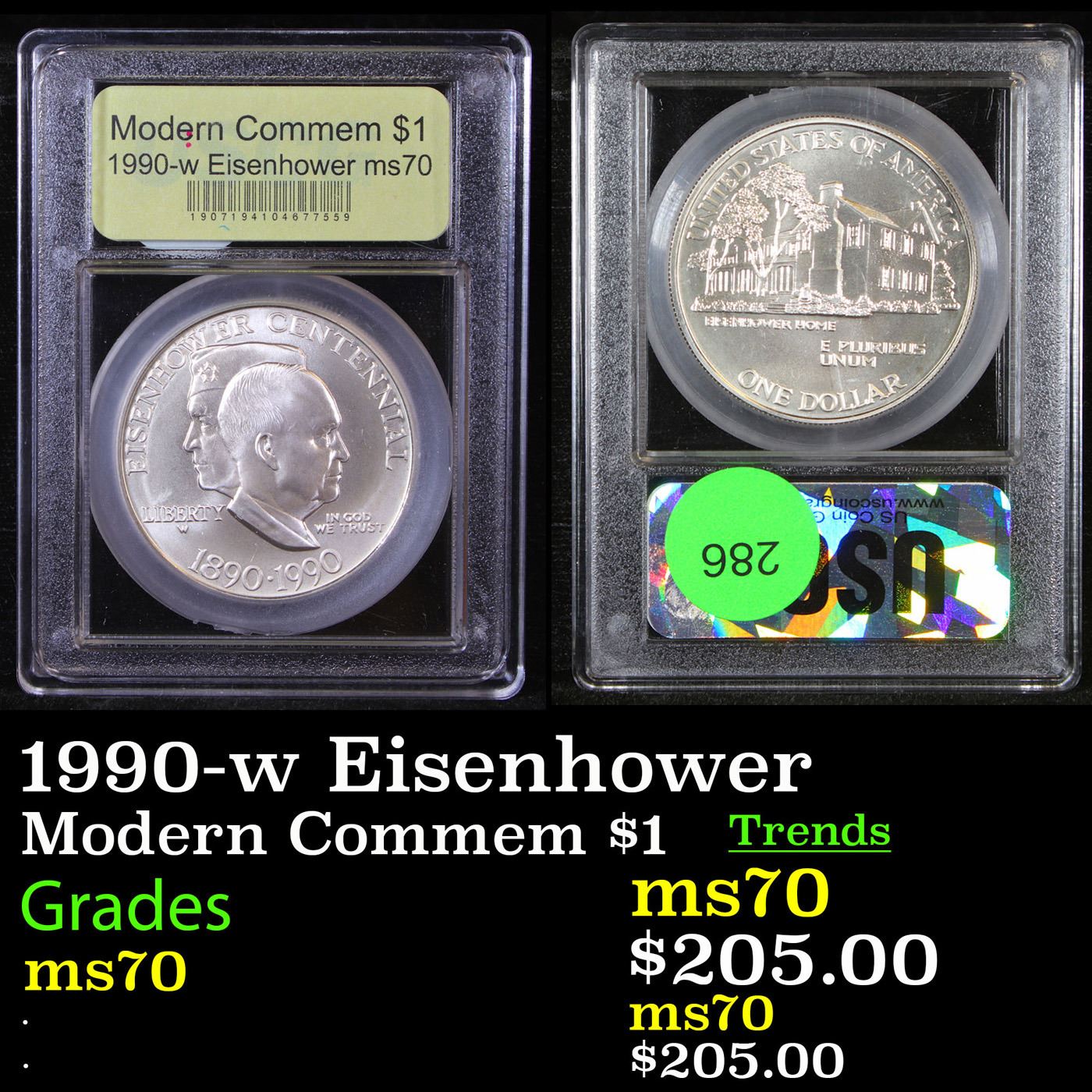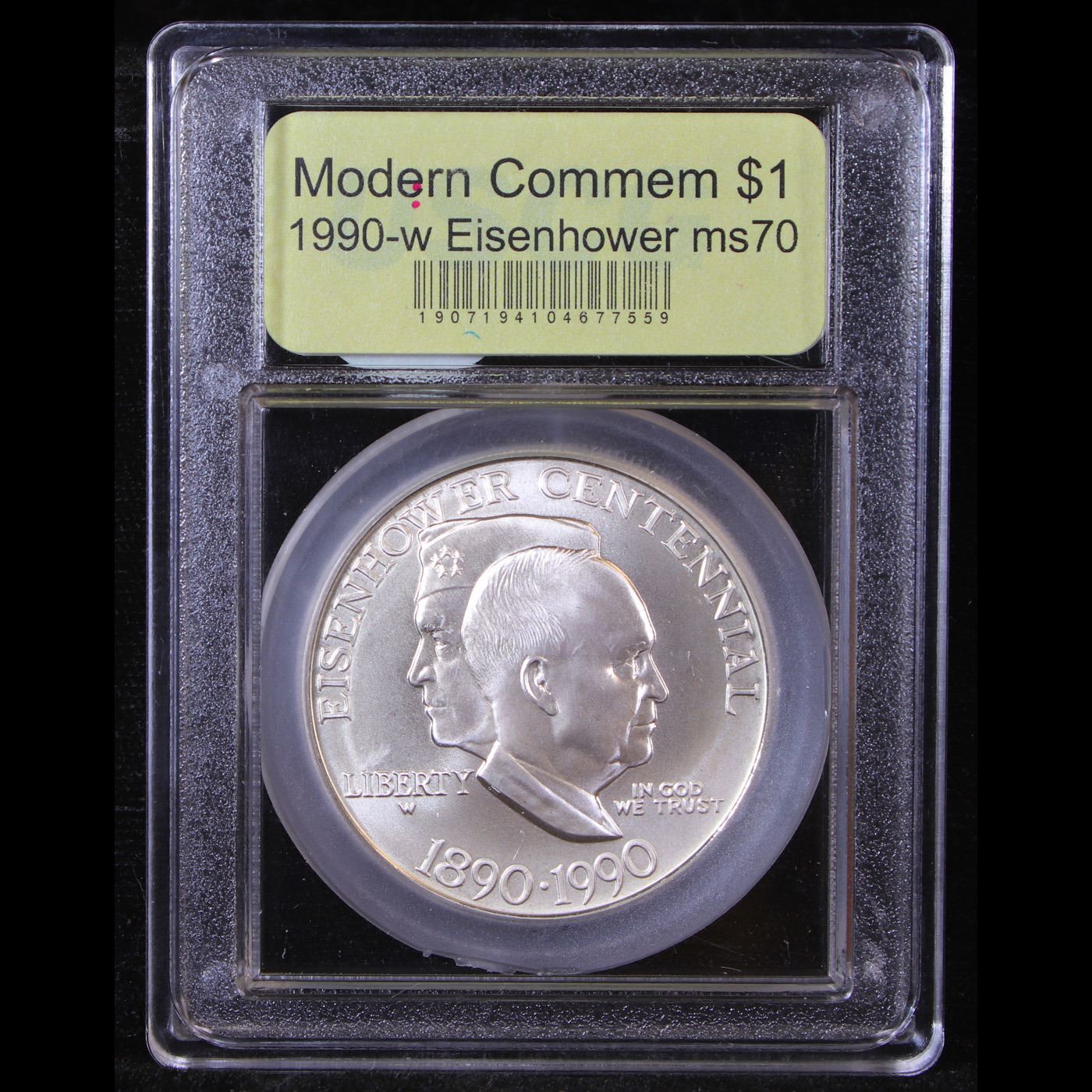 1990-w Eisenhower Modern Commem Dollar $1 Graded ms70, Perfection By USCG. The Mint produced both an Uncirculated and Proof version of this coin. The Proof coin is much more common as it has a mintage which is almost five times higher than the Uncirculated version. The 1990 Eisenhower Centennial Commemorative Silver Dollar was issued to mark the 100th anniversary of the birth of Dwight D. Eisenhower on October 14, 1890. The coin honors him as a Five Star General and the 34th President of the United States. This is the only U.S. coin to feature two portraits of the same person on the same side of the coin. This example was graded Perfection ms70 by USCG.