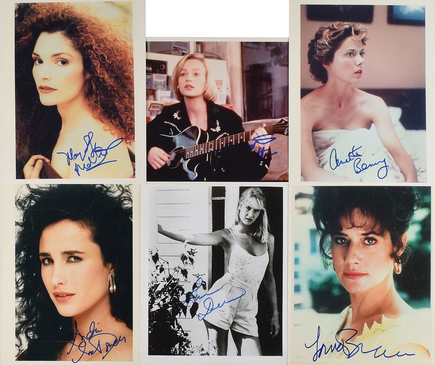 Six glossy photos of famous actresses from the 1990s, 8 x 10 and 10 x 8, each signed in blue felt tip by the pictured movie star, including: Annette Bening, Lorraine Bracco, Laura Dern, Andie MacDowell, Mary Elizabeth Mastrantonio, and Samantha Mathis. In overall fine condition.