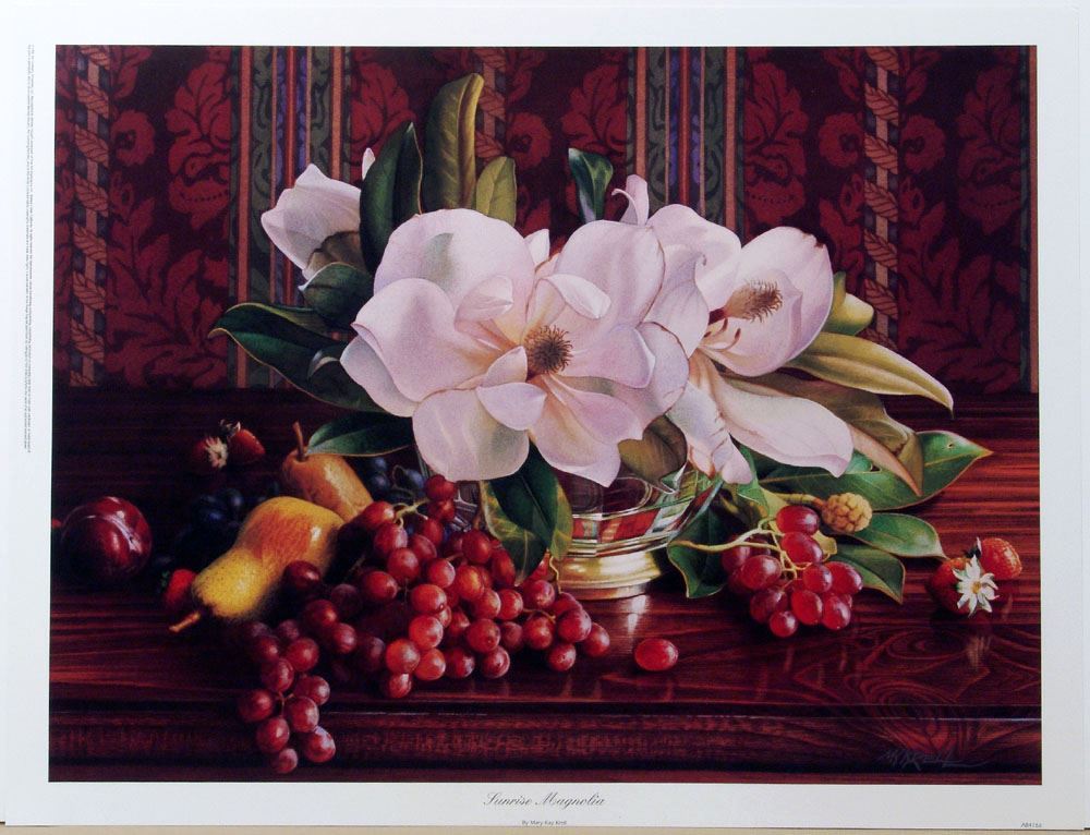 This is a beautiful vintage 1990s botanical print by Mary Kay Krell titled Sunrise Magnolia. SIZE: Approx. 20" x 26".