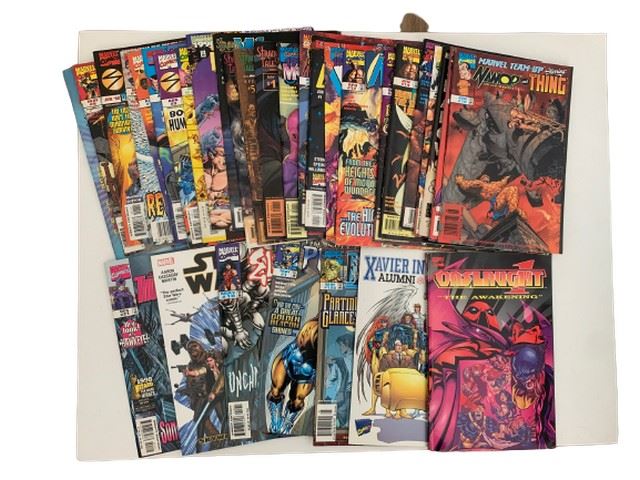Lot of approximately 33 pieces including comics and some trades. Featuring titles from Onslaught, Star Wars, Electra, The Spectacular Prodigy, Excalibur, Thunderbolts, Marvel Universe, Cable and Machine Man, Kazan, Journey into Mystery, The Incredible Hulk, Shadows and Light, Fury Agent 13, Dracula Lord of the Undead, Marvel Team up starring Namor and the Thing, Maverick, Seeker 3000, Gambit, Heroes for Hire, Namor and Doctor Strange, Iron fist, Werewolf by Night, Man Thing, Dark Corners, Machine Man and Bastion, as well as a Marvel catalog from July 1998. This all comes from the collection of a former Marvel employee.