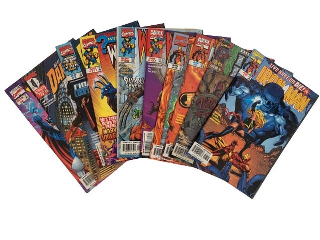Lot of 10 comics featuring Daredevil, Wolverine, and Iron Man and Unlimited Access Vol 1 #4 from DC and Marvel comics. Includes Daredevil # two, December 1998, Wolverine # 3, February 1998, #111, August 1998, #128 from September 1998, n#127, August 1998, The Invincible Iron Man #10, November 1998, #5, June 1998 #9, July 1997, and Live Free or Die #1, Iron Man #7 August 1998. All in good condition with the exception of Wolverine #128, which shows wear. All from a former marvel employee.