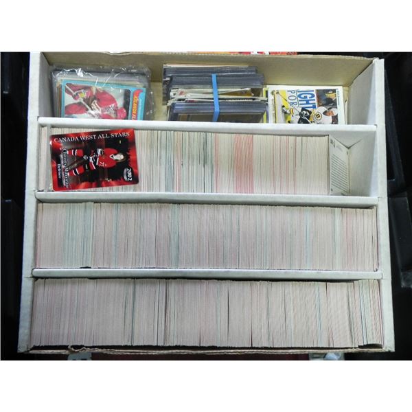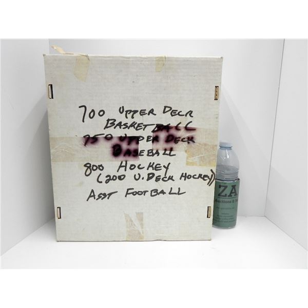 MASSIVE SQUARE WHITE BOX WITH MISC SPORTS TRADING CARDS IN IT. BOX SAYS 700 UPPER DECK BASKETBALL, 750 UPPER DECK BASEBALL,800 HOCKEY(200 U DECK HOCKE
