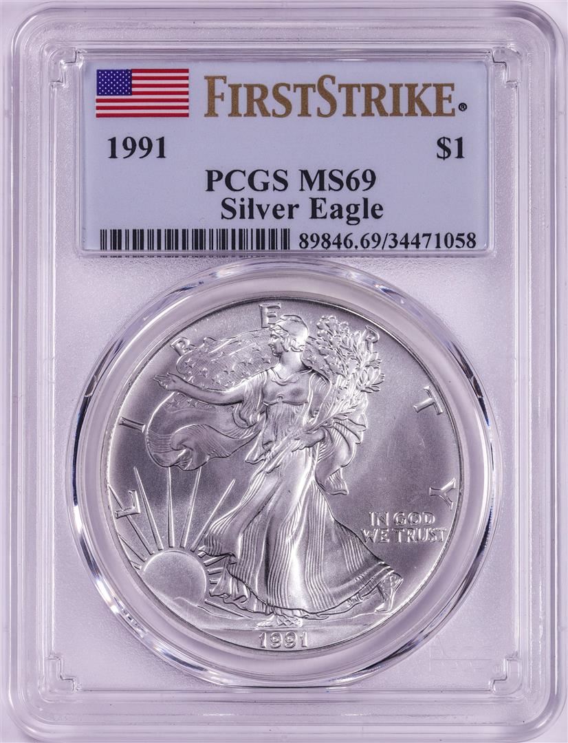 One 1991 $1 American Silver Eagle Coin PCGS MS69 First Strike. PCGS Graded.