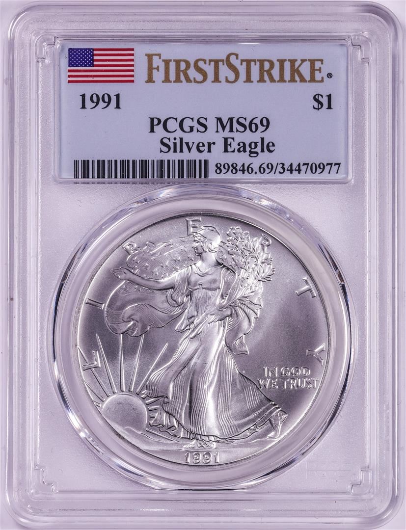 One 1991 $1 American Silver Eagle Coin PCGS MS69 First Strike. PCGS Graded.