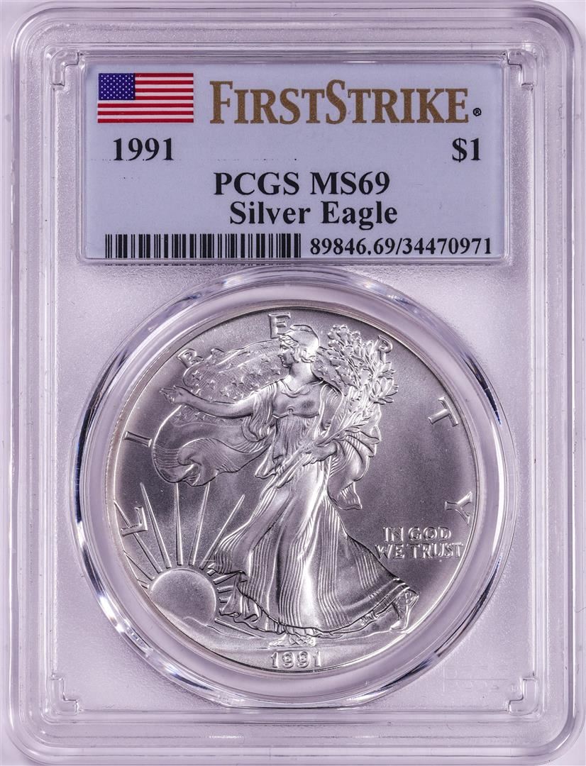 One 1991 $1 American Silver Eagle Coin PCGS MS69 First Strike. PCGS Graded.