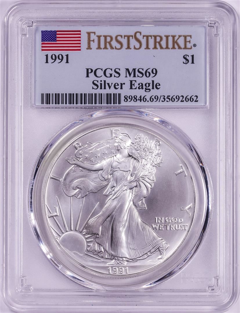 One 1991 $1 American Silver Eagle Coin PCGS MS69 First Strike. PCGS Graded.
